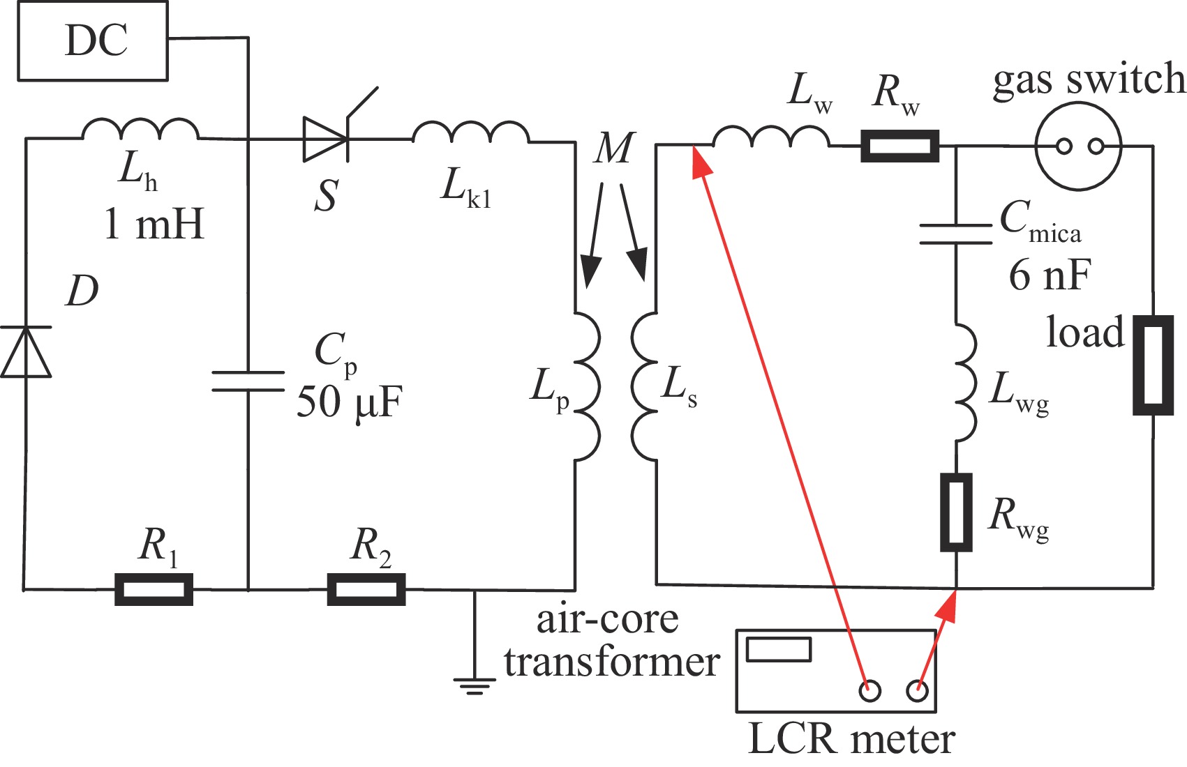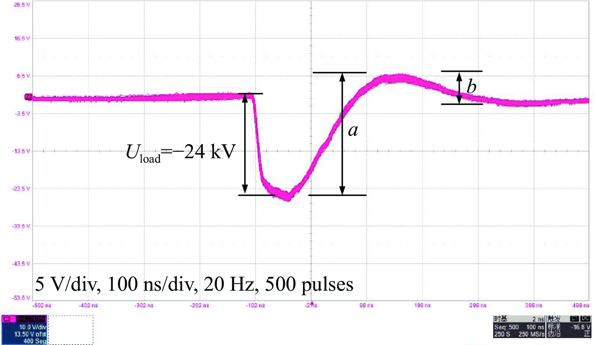 为实现脉冲驱动源的紧凑化,研制了基于PFN-Marx的高功率脉冲驱动源。7级PFN-Marx采用单级性脉冲充电方式,有利于PFN-Marx内部结构以及Tesla变压器的紧凑化设计;采用锂电池供电的高功率恒流充电电源给Tesla变压器的初级电容充电,供电电源体积小且灵活可移动;PFN各级充电回路电感相同,脉冲充电波形完全同步,模块化结构设计,可以灵活增加驱动源的模块数提高输出功率。脉冲驱动源输出单脉冲能量为45.6 J,在75 Ω负载条件下输出脉冲幅值为−189.2 kV、脉宽93.2 ns、前沿为8.4 ns的准方波脉冲,功率为477 MW。锂电池充电及控制电源的体积为482 mm×443 mm×177 mm,重量为12.6 kg。Telsa变压器及PFN-Marx发生器集成化设计后的体积为ϕ370 mm×848 mm,重量为28.7 kg。此驱动源样机为更高功率更高性能脉冲驱动源的紧凑化设计提供了参考。