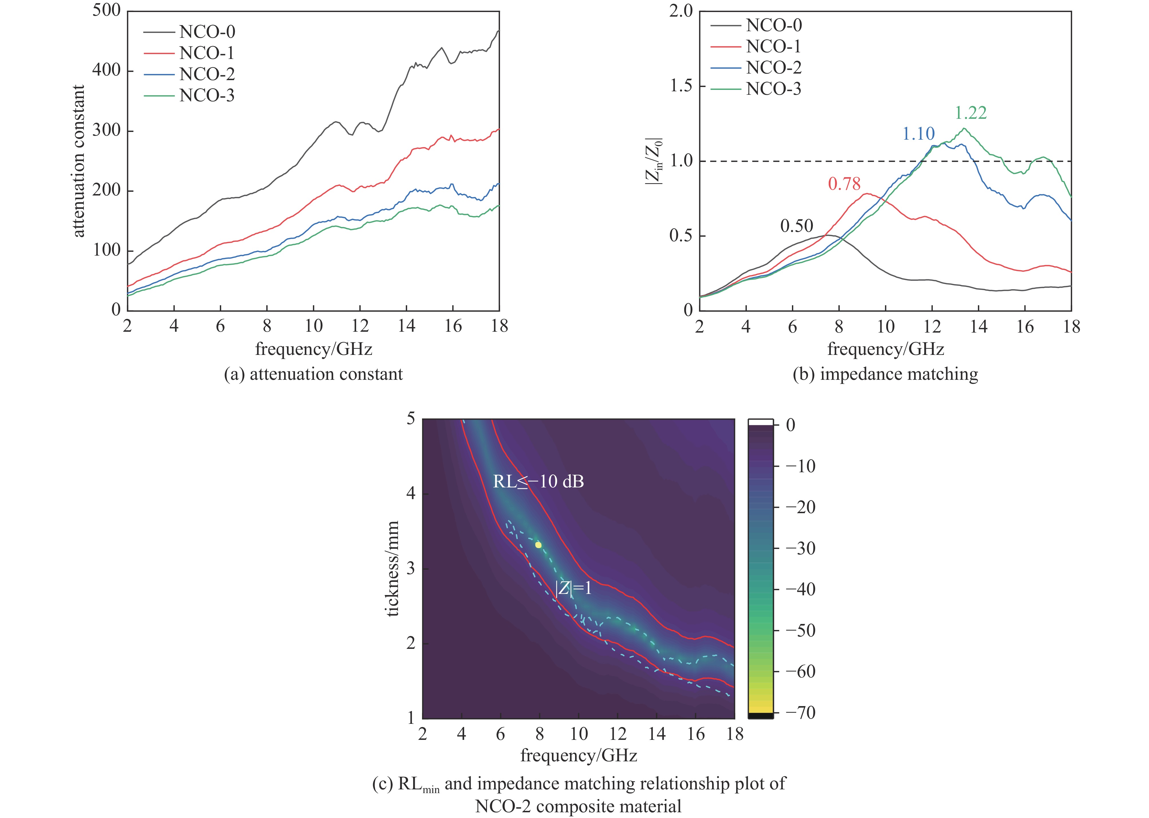 日益增长的电磁辐射对电子设备、人体健康、环境等造成了严重的危害。从生物质衍生的碳基材料,由于高孔隙率、低密度、介电损耗强、来源广泛、成本低廉等优点被认为具有极强的电磁吸收潜力。基于此,本研究以丝瓜作为碳前驱体,引入NiCo2O4磁性粒子,制备了NiCo2O4/C电磁波吸收材料(NCO)。NiCo2O4粒子的引入,不仅增强了复合材料的磁损耗性能,还调节了介电性能,优化了阻抗匹配。由于独特的网状结构以及界面极化、电导损耗、磁损耗等损耗机制的协同作用,NiCo2O4/C复合材料获得了良好的电磁波吸收特性,其最强反射损耗为−47.46 dB,最宽吸收频带为5.68 GHz(12−17.68 GHz),几乎覆盖整个Ku波段。此外,本研究还通过雷达散射截面面积(Radar scattering cross section, RCS)仿真,证明了NCO-2复合材料具有一定的实际应用价值。这项工作为开发绿色可持续的高性能生物质衍生碳基复合材料提供了理论和实验基础。