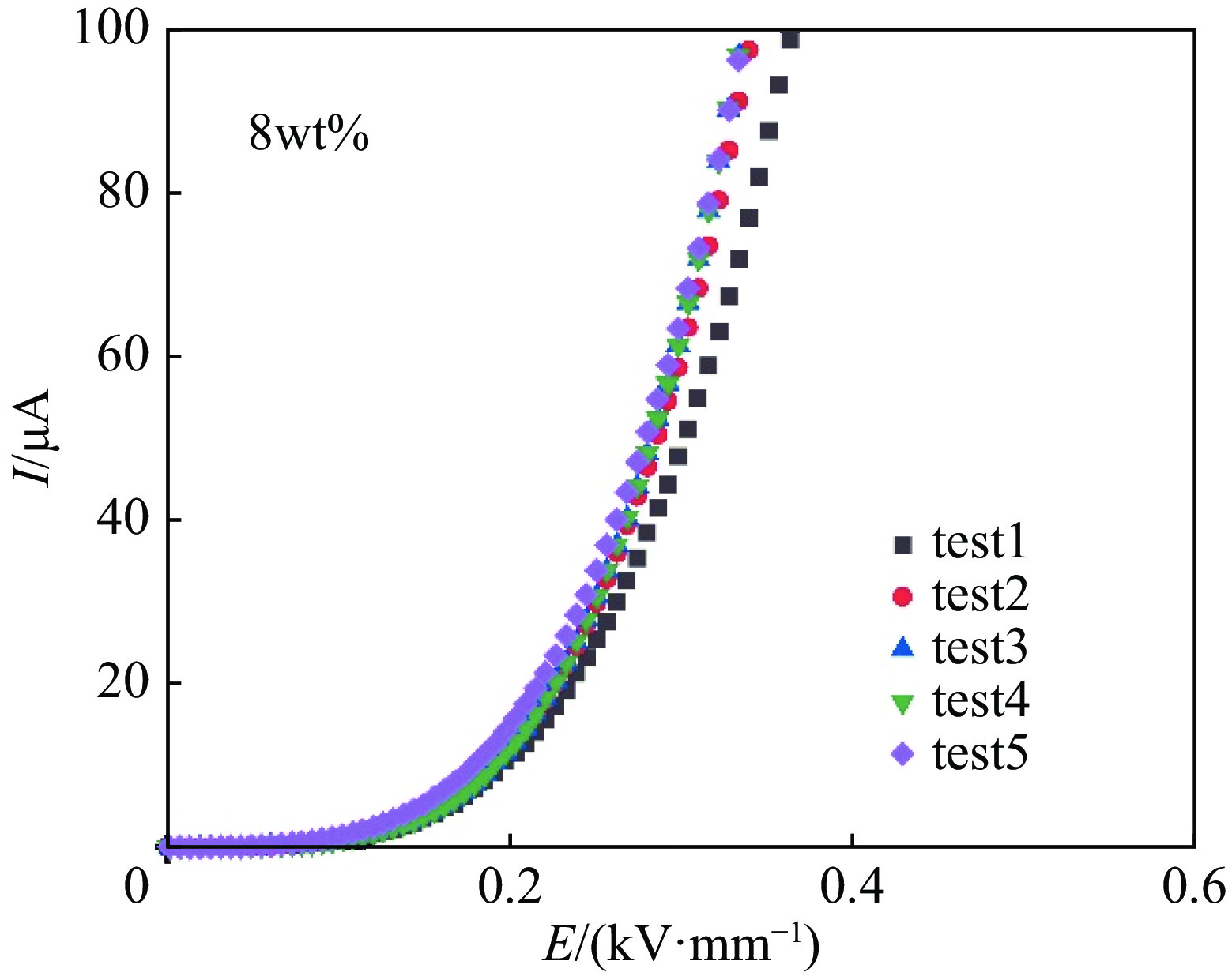 采用溶剂热法合成了氧化锌包覆石墨烯的纳米复合材料。SEM表征显示,氧化锌纳米颗粒均匀覆盖在石墨烯表面,能充分发挥氧化锌的场致相变性能和石墨烯的导电性能及大比表面积优势。制备的GN/ZnO复合材料在质量分数5~8 wt%时,展现出显著的非线性导电特性,其相变阈值电场为0.19~0.53 kV/mm,非线性系数α为4.01~5.44。实验证实,该材料在低电场下保持绝缘性,高电场下迅速转变为高导电状态,抑制静电放电。不同浓度的复合材料展现出不同的开关场强,可根据操作条件和需求调整材料性能。这为开发智能电磁防护材料提供了理论依据和实践指导。