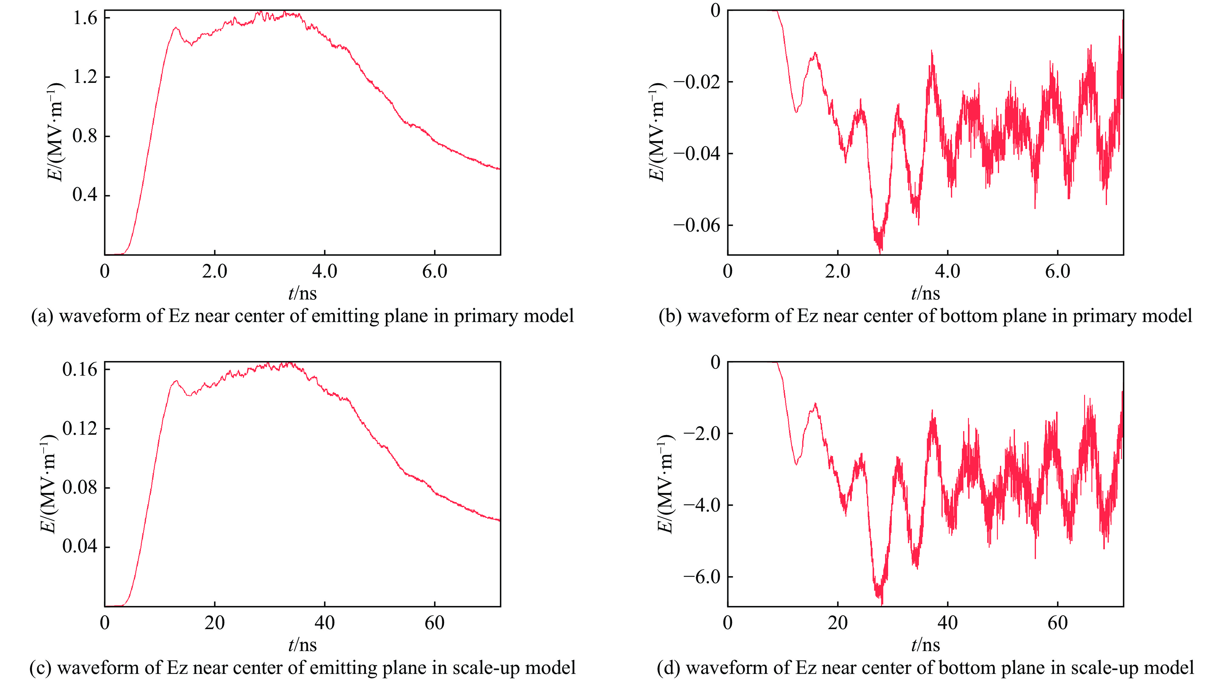 研究系统电磁脉冲(SGEMP)的定标理论,掌握SGEMP的定标法则,并将其应用于腔体SGEMP,提出保持腔壁材料厚度不变的规范变换方法,应用PIC方法进行数值模拟研究,通过对比实验室激光等离子体源条件下的原模型与10倍扩比模型的模拟结果,发现两者在电场、磁场及电荷密度的空间分布规律上呈现严格一致性,幅值大小完全遵循定标关系:发射端面表面电场峰值原模型为2.0 MV/m,扩比模型为200 kV/m;磁场峰值原模型为0.8×10−3 T扩比模型为0.8×10−4 T;电荷密度峰值原模型为6.0×10−3 m−3,扩比模型为6.0×10−5 m−3。模拟结果验证了定标法则应用于腔体SGEMP的有效性。该研究为腔体SGEMP的物理机制解析及实验室模拟实验设计提供了理论依据。