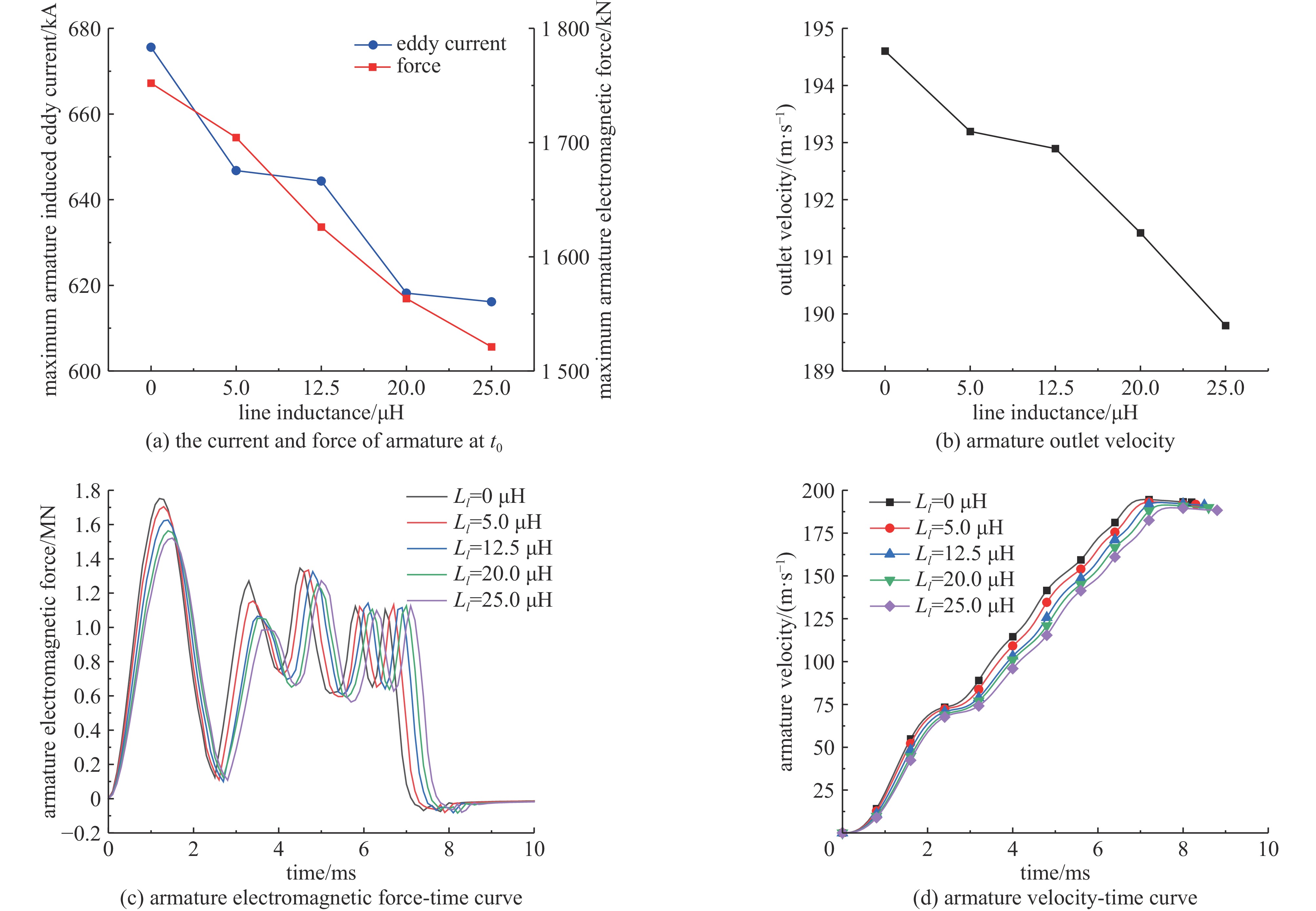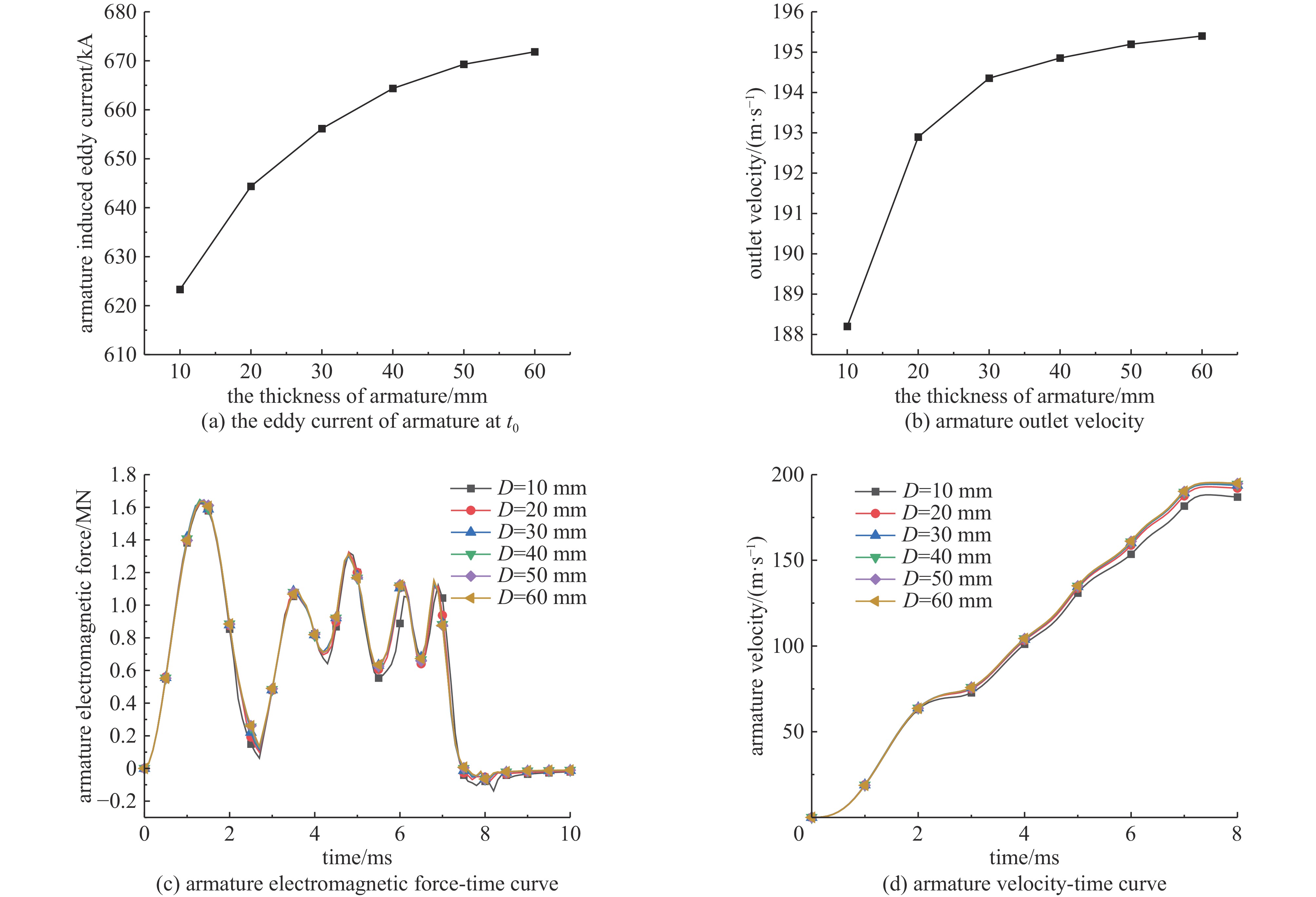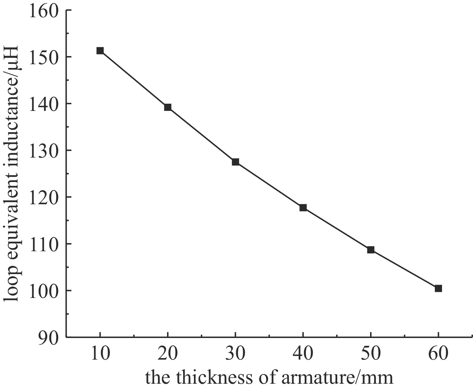 多级同步感应线圈炮的电枢出口速度受线圈-电枢发射系统的结构参数、材料参数及线圈激励电路参数等多种因素的综合影响。由于电枢出口速度直接取决于其受到的轴向电磁力,而电磁力与线圈电流和电枢感应涡流等因素正相关,因此增大电枢出口速度的本质是增大电枢所受电磁力或电枢感应涡流。为探究线圈发射中影响出口速度的因素,基于等效电路模型探讨了提高出口速度的理论路径;并以5级线圈驱动32 kg电枢为研究对象,利用有限元软件Ansys Maxwell仿真分析了影响出口速度的因素。主要结论如下:等效电路分析表明,减小回路总电感可提高出口速度;在实际发射系统中,减小单级线圈匝数、降低矩形导线截面形状因子(径向宽/轴向宽)、增大电枢厚度与长度、减小线路电感,均可提高电枢出口速度;其中,线圈匝数由48匝降至24匝时,出口速度提升5.2%;电枢长度由110 mm增大至440 mm时,出口速度提升15.3%。最终仿真实现5级线圈驱动32 kg电枢的出口速度达202.1 m/s,发射效率为33.3%。本文研究结果为设计多级同步感应型线圈发射实验方案提供了一定的理论支撑。