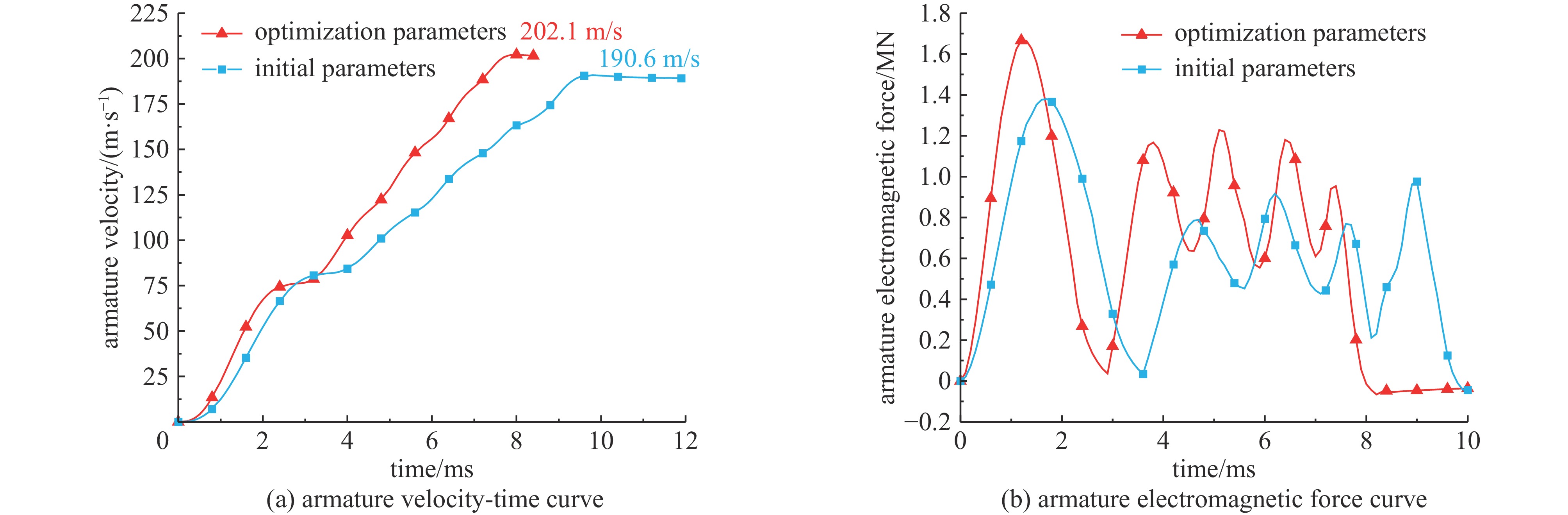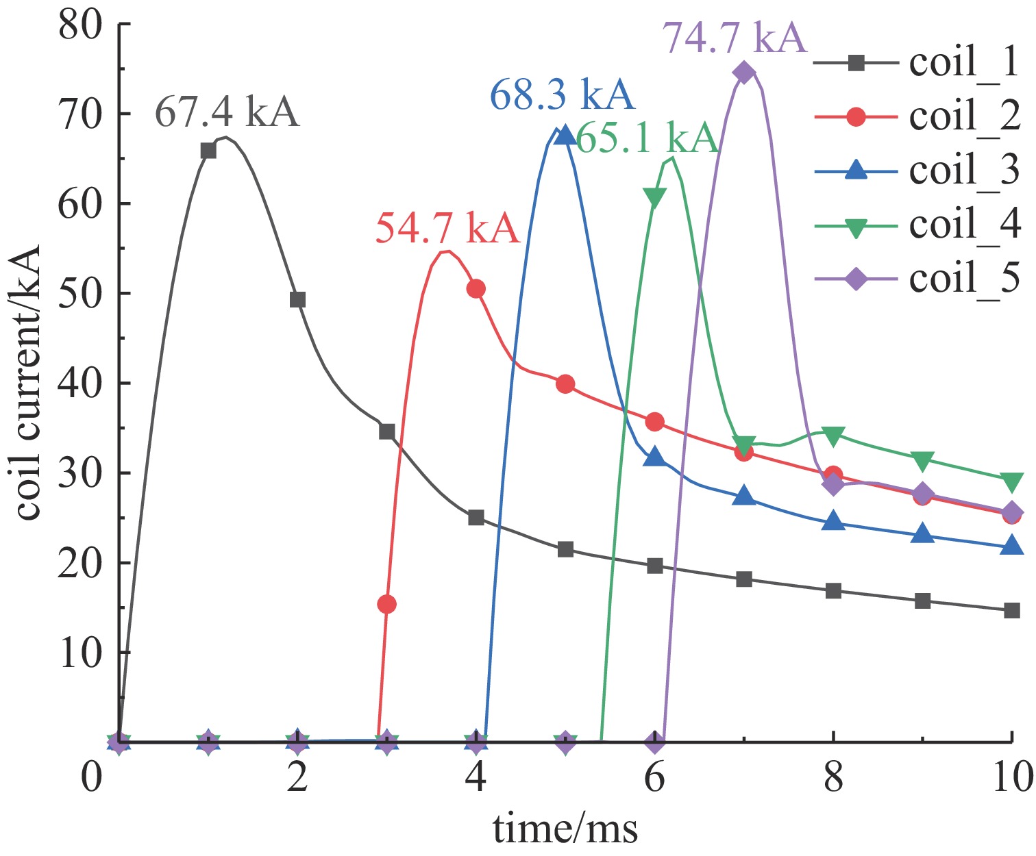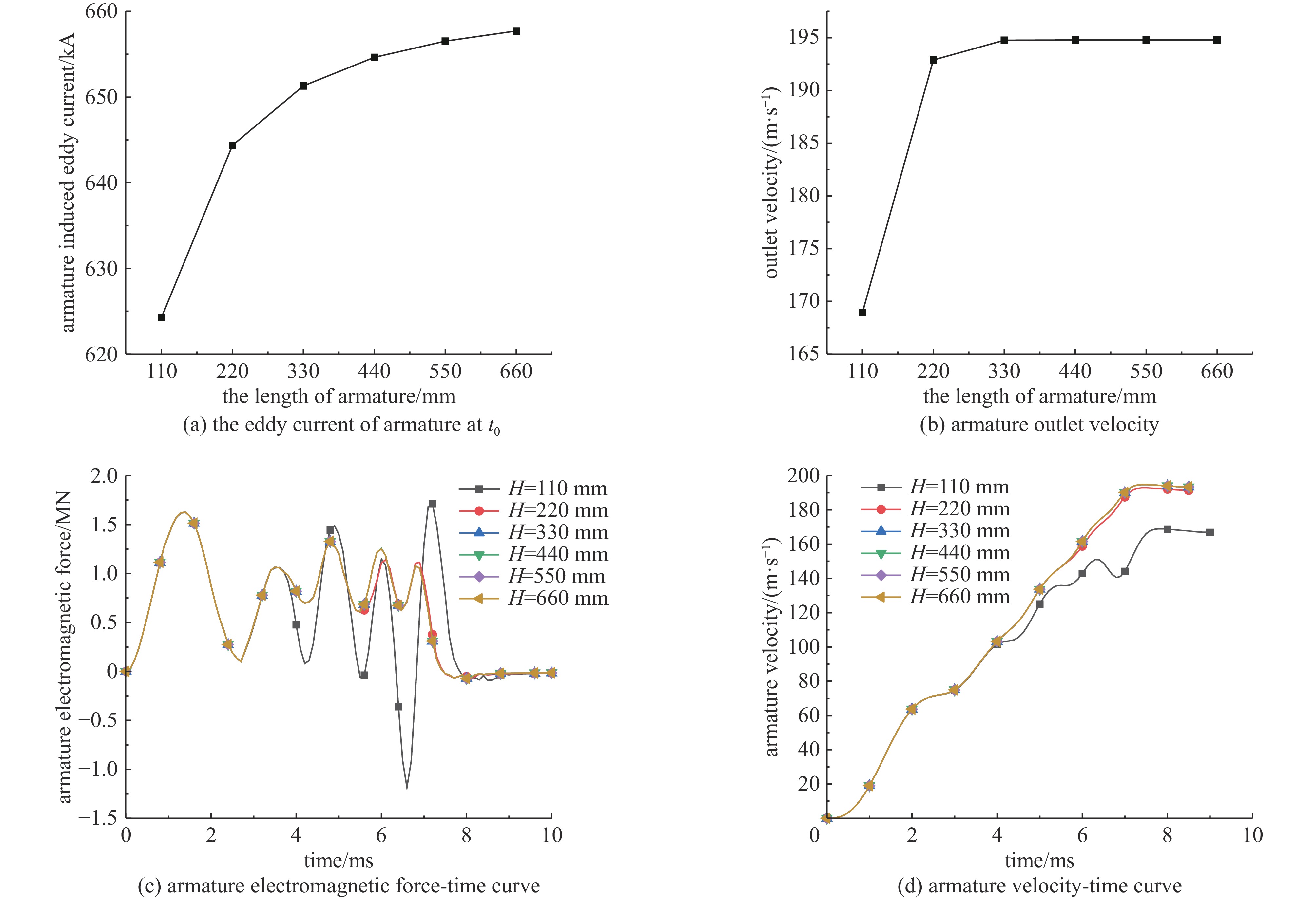 多级同步感应线圈炮的电枢出口速度受线圈-电枢发射系统的结构参数、材料参数及线圈激励电路参数等多种因素的综合影响。由于电枢出口速度直接取决于其受到的轴向电磁力,而电磁力与线圈电流和电枢感应涡流等因素正相关,因此增大电枢出口速度的本质是增大电枢所受电磁力或电枢感应涡流。为探究线圈发射中影响出口速度的因素,基于等效电路模型探讨了提高出口速度的理论路径;并以5级线圈驱动32 kg电枢为研究对象,利用有限元软件Ansys Maxwell仿真分析了影响出口速度的因素。主要结论如下:等效电路分析表明,减小回路总电感可提高出口速度;在实际发射系统中,减小单级线圈匝数、降低矩形导线截面形状因子(径向宽/轴向宽)、增大电枢厚度与长度、减小线路电感,均可提高电枢出口速度;其中,线圈匝数由48匝降至24匝时,出口速度提升5.2%;电枢长度由110 mm增大至440 mm时,出口速度提升15.3%。最终仿真实现5级线圈驱动32 kg电枢的出口速度达202.1 m/s,发射效率为33.3%。本文研究结果为设计多级同步感应型线圈发射实验方案提供了一定的理论支撑。