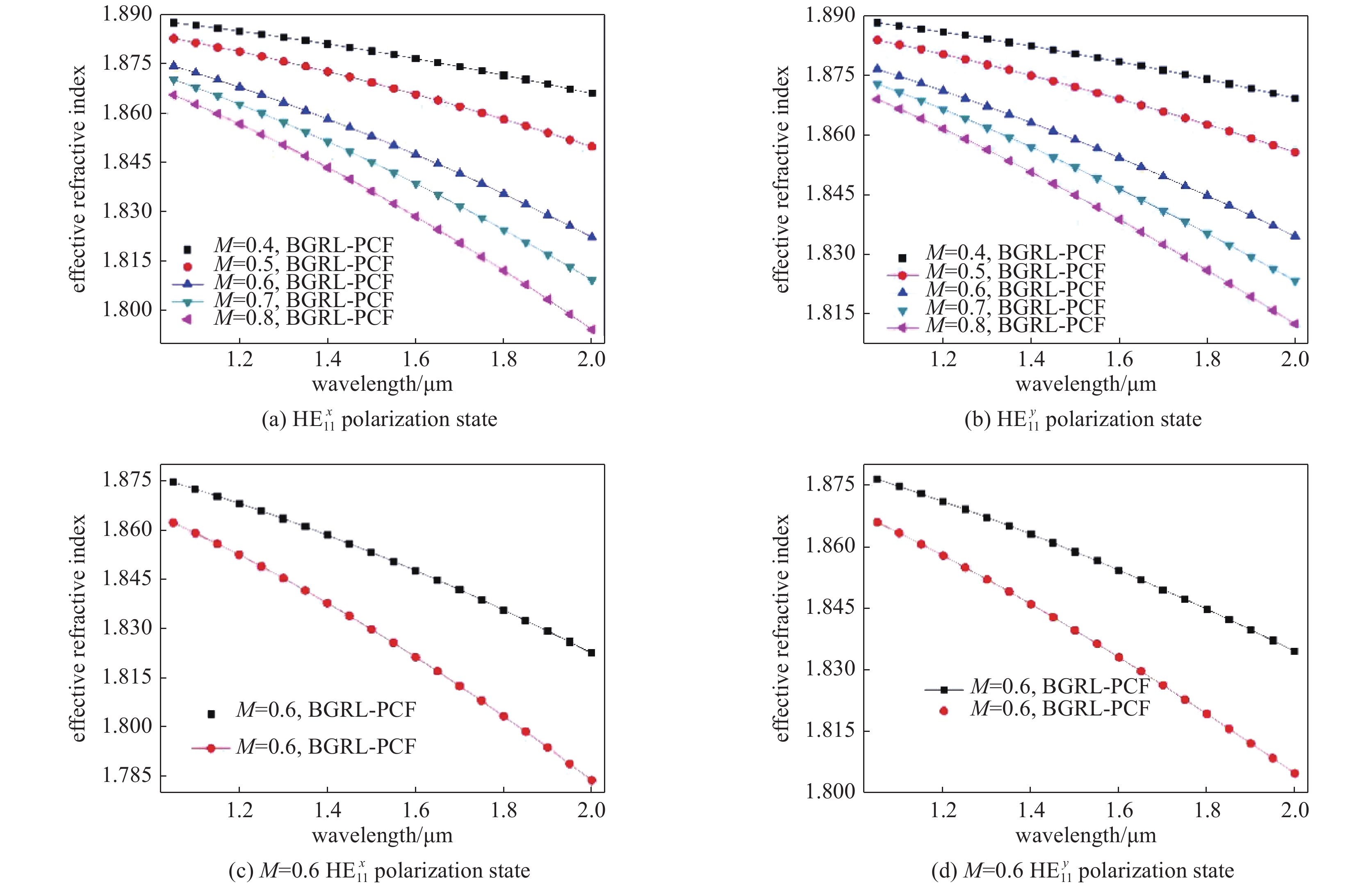 非对称结构光子晶体光纤应用广泛。其良好的偏振特性、灵活的色散调控能力以及低限制损耗品质,对于优化与改善偏振光纤器件、非线性光学光纤、光通信光纤、光纤传感器等性能发挥着关键的作用。选用高折射率铋锗镓激光玻璃为材料,设计了八边形阵列、矩形晶格排列的光子晶体光纤,纤芯缺陷区包层及外包层均为圆形空气孔。模拟实验数据显示,结构参数为M=0.5,0.6时,在波长为1.55 μm处的双折射系数分别为1.16×10−2和1.33×10−2;在近红外波段短波区,矩形晶格结构光子晶体光纤的色散范围分别在±30 ps·nm−1·km−1之间及−18~32 ps·nm−1·km−1之间。色散斜率较低,曲线具有零色散点,展现了良好的连续谱调控能力;在1.00~1.90 μm波段内,当M=0.5,0.6时,光纤限制损耗稳定在10−7~10−9 dB·km−1之间;在1.55 μm处,限制损耗测量值分别为2.32×10−7和1.62×10−8 dB·km−1。