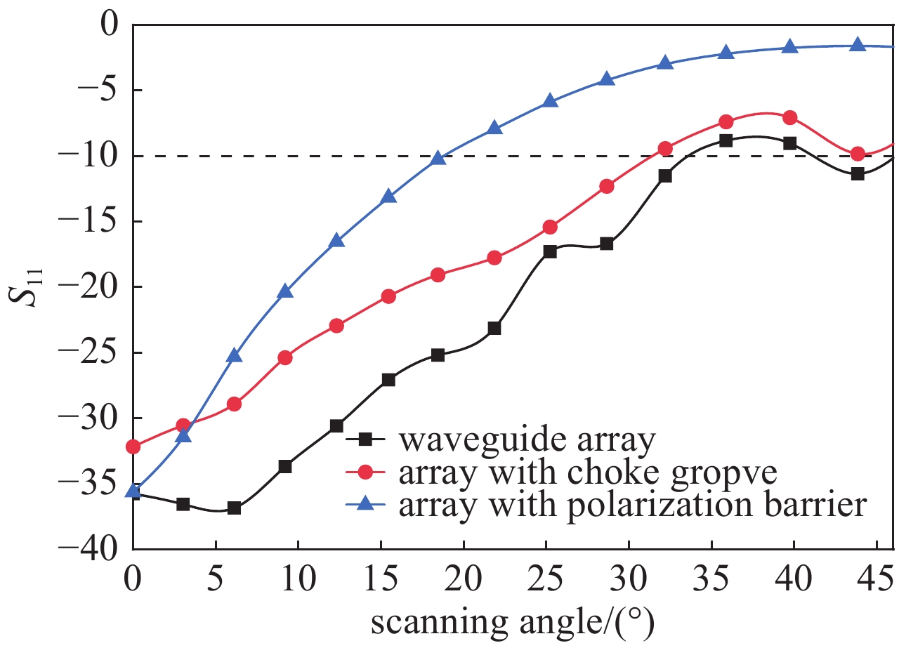 在传统高功率缝隙波导阵列中,缝隙间的相互耦合严重影响了阵列的宽角扫描能力。以实现阵列宽角波束扫描为目标,通过分析阵列扫描特性,从提高缝隙阵元间隔离度的角度出发,提出在阵列中引入隔离栅结构,降低了阵元间耦合对阵列大角度扫描时的影响。在此基础上,设计了基于波导窄边斜缝的谐振式阵列天线,采用电磁仿真软件优化阵列。数值模拟结果表明,未采取措施前阵列的最大扫描范围为±34°,引入隔离栅后扫描范围可扩大至±45°,波导端口S11≤−10 dB,增益仅下降了2.3 dB,单根缝隙波导功率容量达330 MW,有应用于高功率微波领域的潜质。
