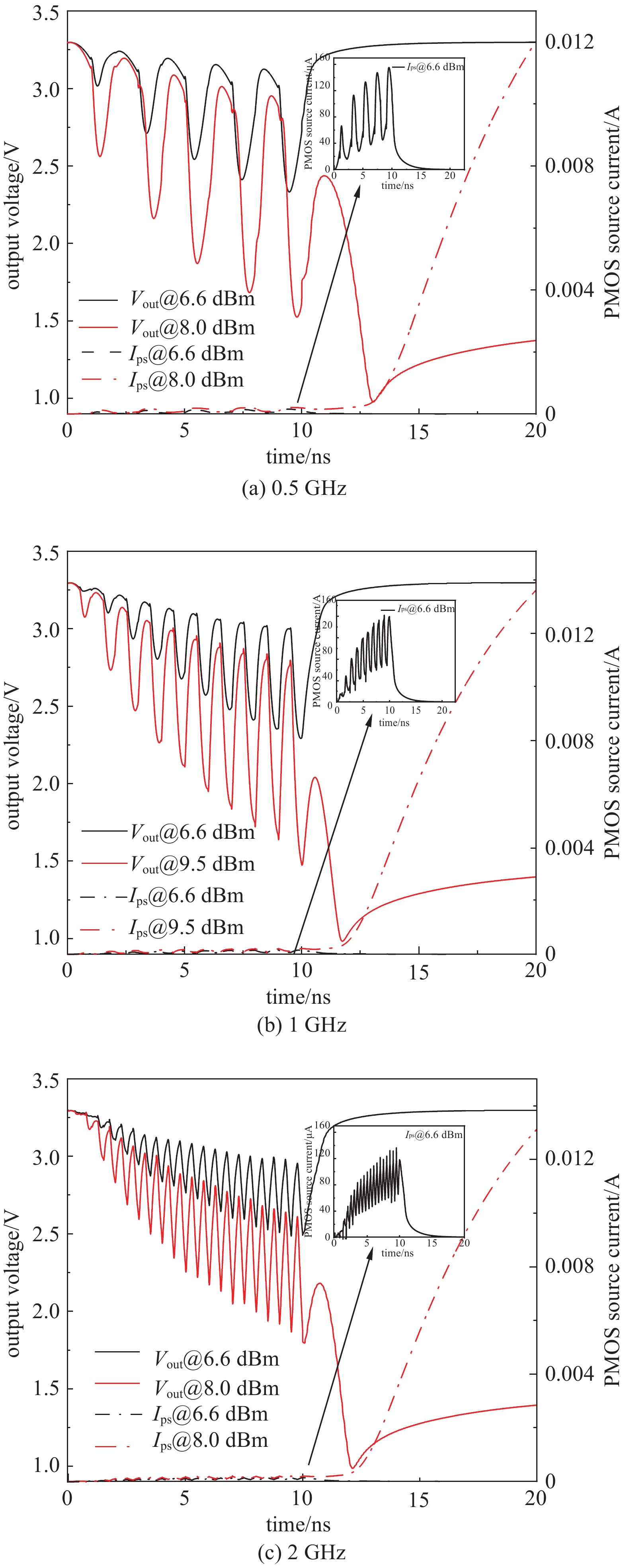 A two-dimensional electrothermal model of CMOS NAND gate is established by Sentaurus-TCAD, and the upset and damage effects and mechanisms of CMOS NAND gate are studied with the injection of electromagnetic pulse. The results show that under EMP injection, the output voltage and internal peak temperature of the device show a periodic “decline-rise”. After the EMP is removed, the output voltage stays at an abnormal value, the PMOS source current increases, the temperature keeps rising, and finally burn-out occurs in the PMOS source, due to the latch-up effect inside the device. As the pulse-width increases, the damage power threshold decreases and the damage energy threshold increases. The relationship between the pulse-width τ, the damage power threshold P and the damage energy threshold E is obtained by data fitting. The results can be used to evaluate the damage effect of EMP and provide guidance for device-level EMP anti-damage reinforcement design.