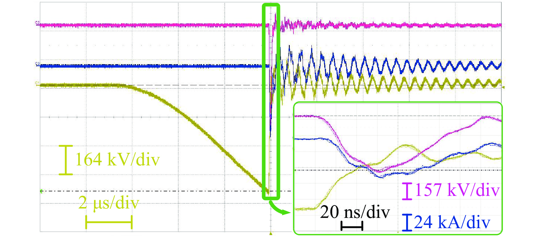 全固态电感储能型脉冲形成线调制器是实现高重复频率、电压高增益和短脉冲输出的一种全新方案。但开关非理想的动态特性和传输线固定的物理空间尺寸限制,难以实现高压短脉冲的产生和调控。为解决上述难题,通过电磁场分析建立了碳化硅场效应器件开关驱动模型,发现高速驱动和开关器件低寄生参数能有效改善开关动态特性,提出了板上高速开关及驱动集成设计解决方案。基于波过程分析和多开关时序逻辑控制理论,提出多开关削波电路拓扑方法和主动负载阻抗调制技术。实验结果表明,该调制器可产生上升时间2.1 ns,下降时间3.5 ns,脉冲宽度5.1 ns的方波短脉冲,并且脉冲宽度5~20 ns连续可调。10级叠加后验证了调整器高压能力,初级储能充电电压25 V时,电压增益可达336倍,重复频率200 kHz。