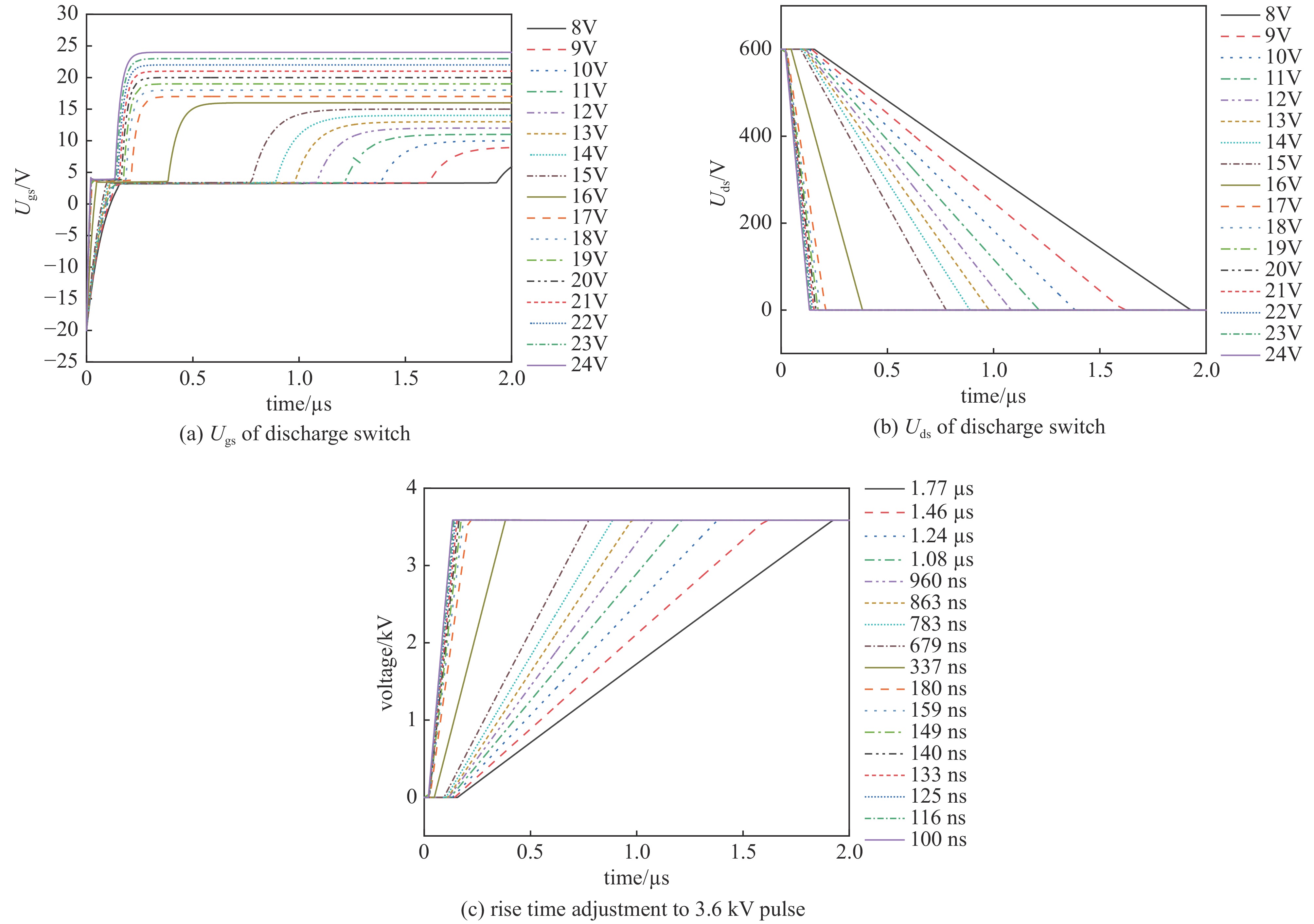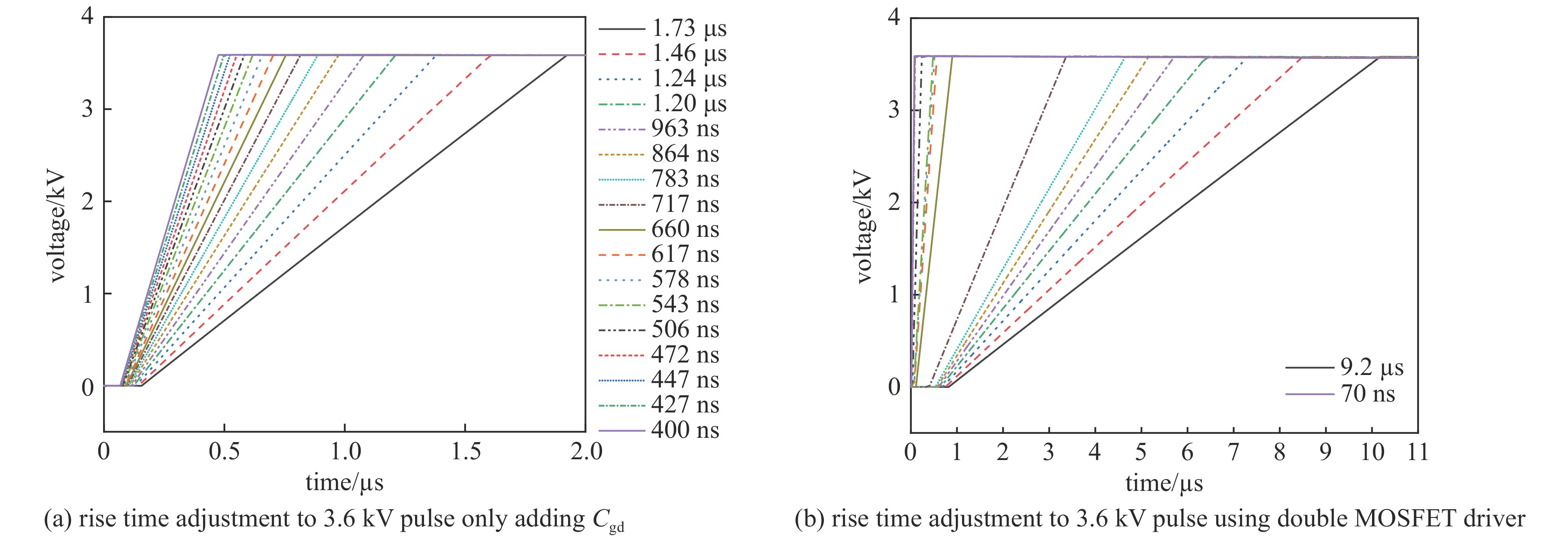为了调节固态Marx发生器输出脉冲的边沿,提出了一种新型的的驱动电路,该方案通过调整充放电管的驱动电压,结合驱动电路的硬件结构,调节米勒平台时间,进而调整充放电管开通速度,实现了对于高压输出脉冲的边沿调节,其结构简单,不需要每级独立的控制信号。对于该电路中驱动电压和开关管开通速度的关系建立了模型进行了推导。结合理论分析结果设计了驱动电路的参数,仿真结果表明该驱动电路能够调节输出脉冲边沿。搭建带有设计参数下驱动电路的固态Marx发生器在容性负载下和阻性负载下进行了实验验证。利用该方案实现了对于6级Marx电路的3.6 kV输出脉冲在55~7.7 µs的边沿调节,验证了该方案的可行性,并对比分析了不同阻性负载对于脉冲边沿造成的影响。实验结果表明:该电路在提高固态脉冲电源的边沿调节性能方面有独特的优势。