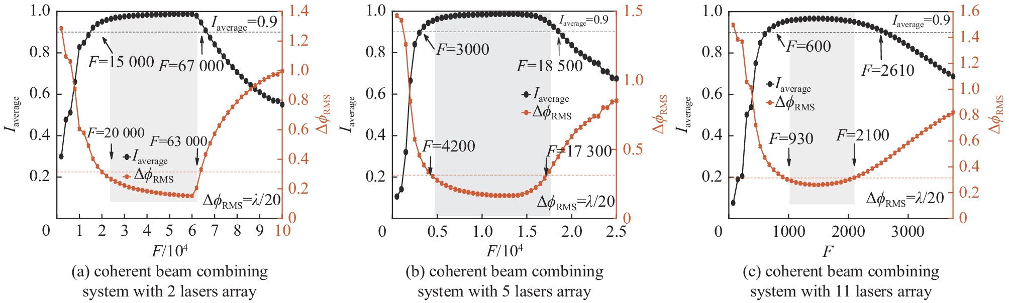 分析了多抖动算法的工作原理,通过波动光学原理以2-11路相干合成系统作为数学模型进行仿真模拟,引入了动态噪声模型,以总合成光束的均方根相位误差作为评价函数,分析了不同阵列规模下的相干合成系统中噪声频率以及噪声振幅对系统相位锁定效果的影响,当噪声频率或噪声振幅过大,超出算法补偿相位噪声的能力时,便会锁相失败。证明了增益系数与调制振幅存在一个最优区间且只有处于该区间内时,才能快速完成锁相。引入有效控制带宽概念,用以直观评价多抖动算法的锁相性能,研究表明,有效控制带宽与采样频率、第一路调制频率成正比例,与噪声振幅成反比例,且随着阵列规模增大,有效控制带宽降低。