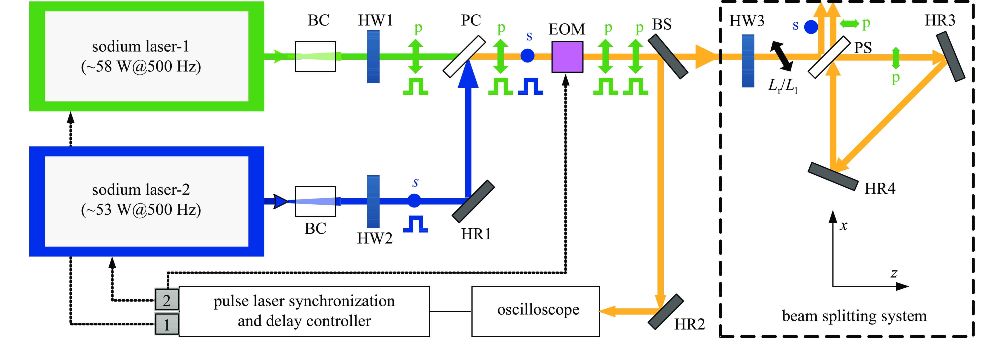 研究了脉冲光束的偏振和时序非相干合成技术,通过偏振合束器将两路50 W级500 Hz的589 nm钠信标激光在空间上合为一束光线,成功突破了100 W级μs脉冲全固态钠信标激光输出;利用脉冲激光同步延时器控制两路激光脉冲的时序,使其按先后顺序合成一束脉冲激光,重复频率提升到1 kHz。合束后的激光光束质量M2约为1.41,与单光束的光束质量基本保持一致,光斑抖动性约为40 μrad,可满足激光钠导引星自适应光学系统的应用需求。与传统的相干合成方法相比,该偏振和时序非相干合成方案具有结构简单、稳定、效率高的优点,且整个系统无需复杂的相位控制机制,为脉冲激光功率扩展提供了新途径。基于上述技术基础,结合自主提出的精密偏振分光专利技术,在丽江天文台通过一台发射望远镜将四束25 W/束的µs脉冲黄激光发射到钠层,成功产生了四颗钠导引星,这一结果将有助于推动大型地基光学望远镜中多层共轭自适应光学技术的发展。