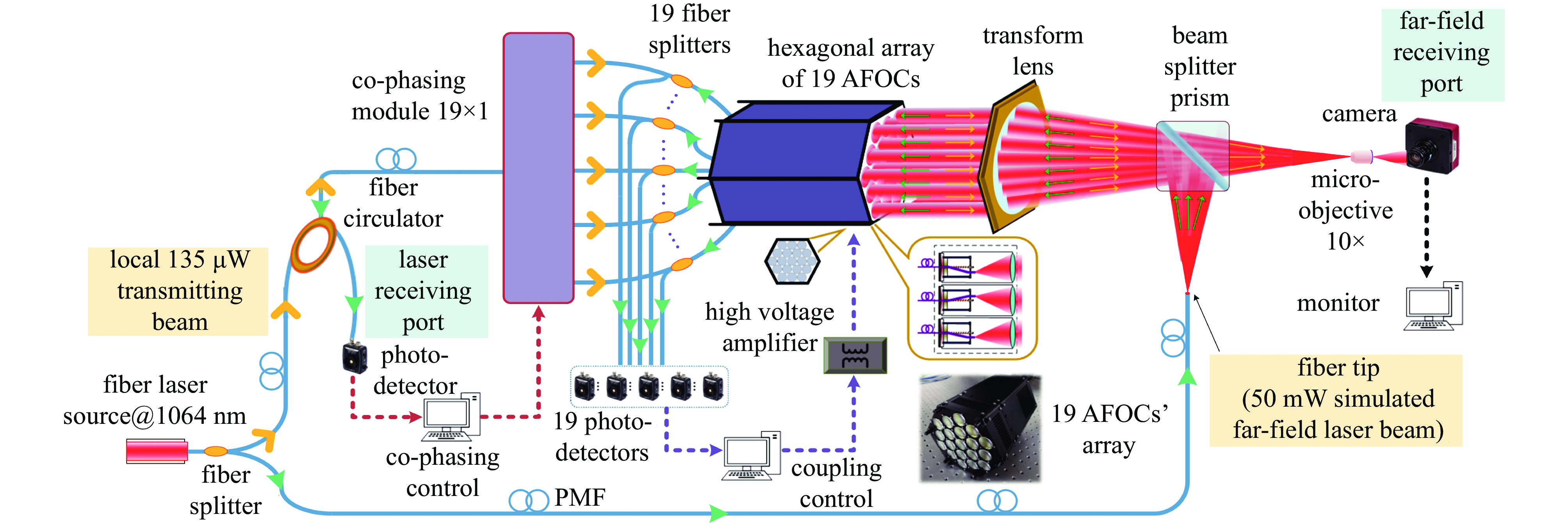 介绍了本课题组近年来在基于空间结构内部锁相的光纤激光相干合成方面的研究工作,给出了空间结构内部锁相相干合成的基本原理,搭建了七路低功率光纤激光阵列实验系统,结果表明在内部相位噪声校正基础之上,可以稳定补偿外部相位差进而实现激光阵列同相位输出,验证了内部锁相方法的可行性。进一步介绍了空间结构内部锁相技术在目标在回路相干合成、阵列光束光场调控等方面的拓展应用,通过实验论证了空间结构内部锁相技术能够有效提升目标在回路相干合成系统的相位控制带宽,并在远场有效生成轨道角动量光束阵列,其拓扑荷数可从−1到+1切换。