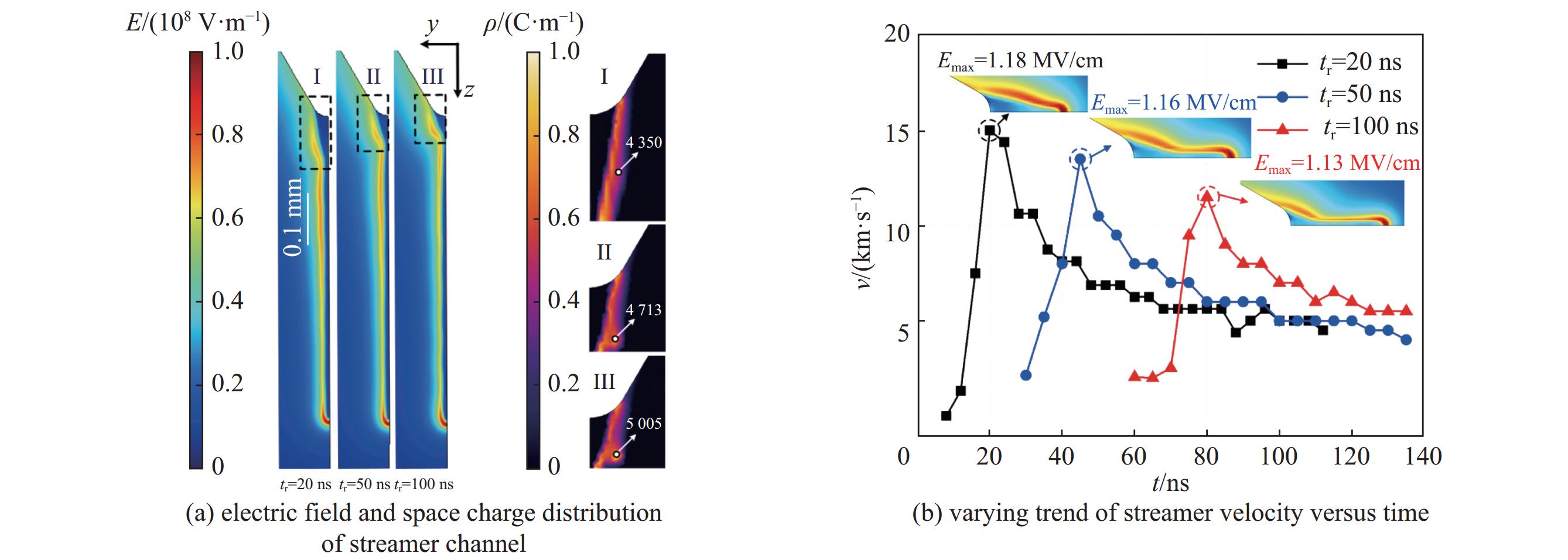 水中流注放电为击穿前放电通道起始与发展的关键过程,但由于涉及物理机制较为复杂且尚不明确,制约了水中放电应用效率的提升。探究了水中正极性丝状流注放电的模式转化特性、重燃特性与分叉特性,明确了通道界面沉积电荷与空间电荷分布对流注发展过程的影响。研究结果表明,水中正极性放电可分为第一类与第二类丝状流注,流注模式转化特性受气液界面电荷弛豫过程影响较大。当外施电压达到加速电压时,第一类流注迅速转化为第二类流注。第一类丝状流注通道内电离形成、熄灭及重燃过程与通道内部电场及气/液界面电荷密度关系密切。第二类丝状流注通道空间电荷分布受电压上升沿与电极表面结构影响较大。电压上升沿时间越长,主通道头部电荷密度与电场强度越低,通道发展速度随之降低。随电极表面微凸结构半径增大,流注分叉点位置将电极表面过渡为主通道根部。受主通道空间电荷分布影响,分支通道发展速度在微凸结构半径为5 μm时呈现先降后升趋势。