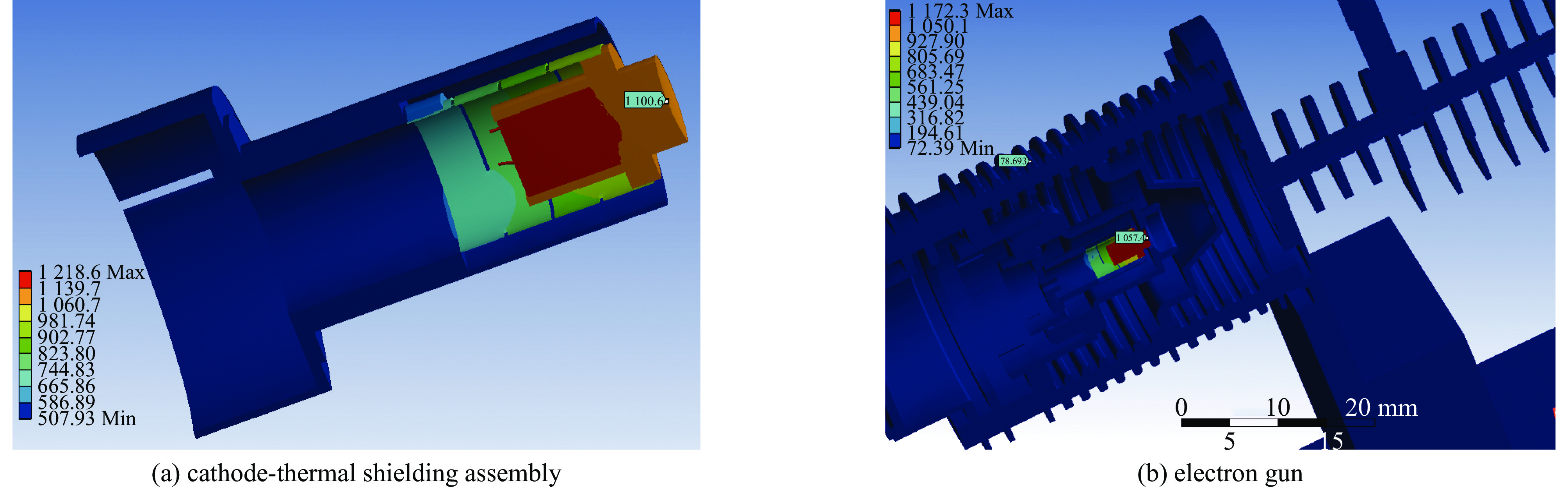 由于行波管工作时无法直接测量阴极温度,目前主要通过组件测温和电子枪热仿真确定阴极工作温度。热辐射不仅是电子枪热量传递的主要途径之一,也是产生热损耗的主要因素,因而热辐射是电子枪热分析不可忽略的因素。对热损耗进行了定量分析,考虑了接触热阻和热损耗,建立了全面的热辐射边界,对阴极-热屏组件进行热仿真,通过调整零件表面发射率拟合了阴极-热屏组件测温实验数据曲线,得到了行波管电子枪高温区域零件表面的发射率,分析了热损耗、零件表面发射率对阴极温度的影响,并通过电子枪热平衡实验验证了所得发射率数值的正确性,进而得到了更准确的电子枪温度分布云图。研究表明,阴极温度950~