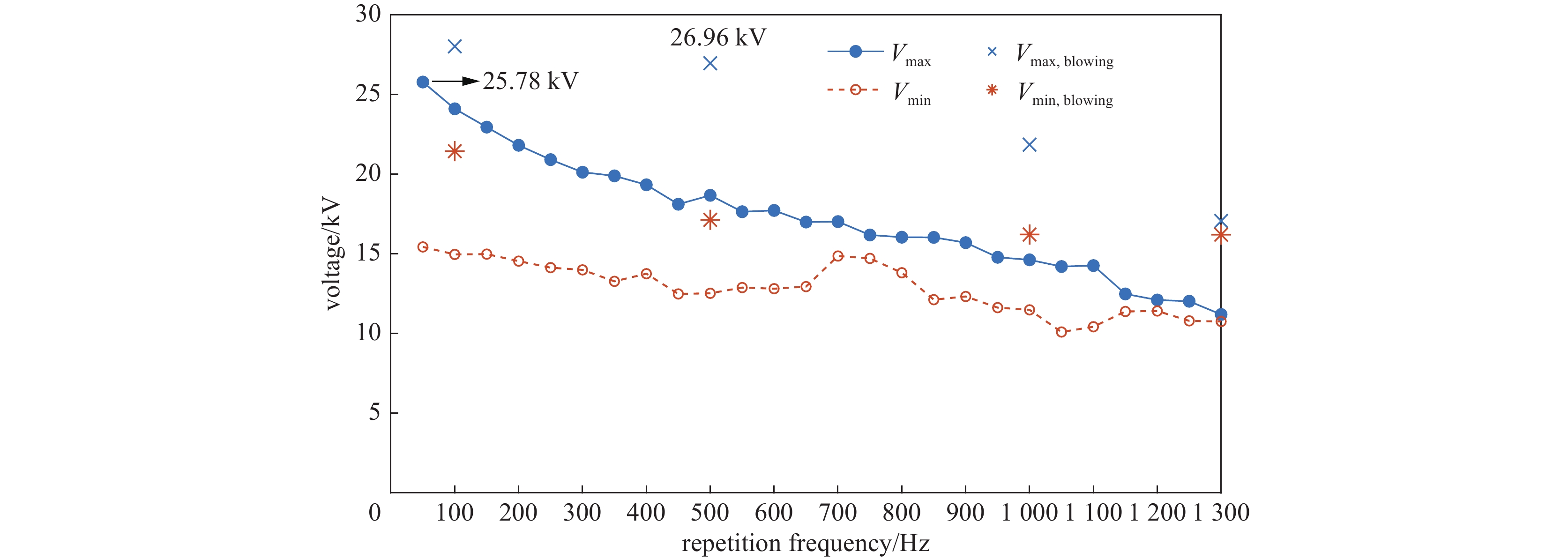 )宽,高频时窄。低频50 Hz时工作范围有10 kV左右,高频1300 Hz时很小,大约只有0.5 kV,这是因为高频时绝缘水平低,触发脉冲对击穿电压的降低作用不明显,因此触发条件下的实际工作电压更接近当前的自击穿电压。吹气可以加快气体绝缘恢复,提高最高和最低工作电压。若开关的最高工作电压为工作前自击穿电压30 kV的90%以上,则不吹气时重复频率低于50 Hz,吹气时最高能到500 Hz。