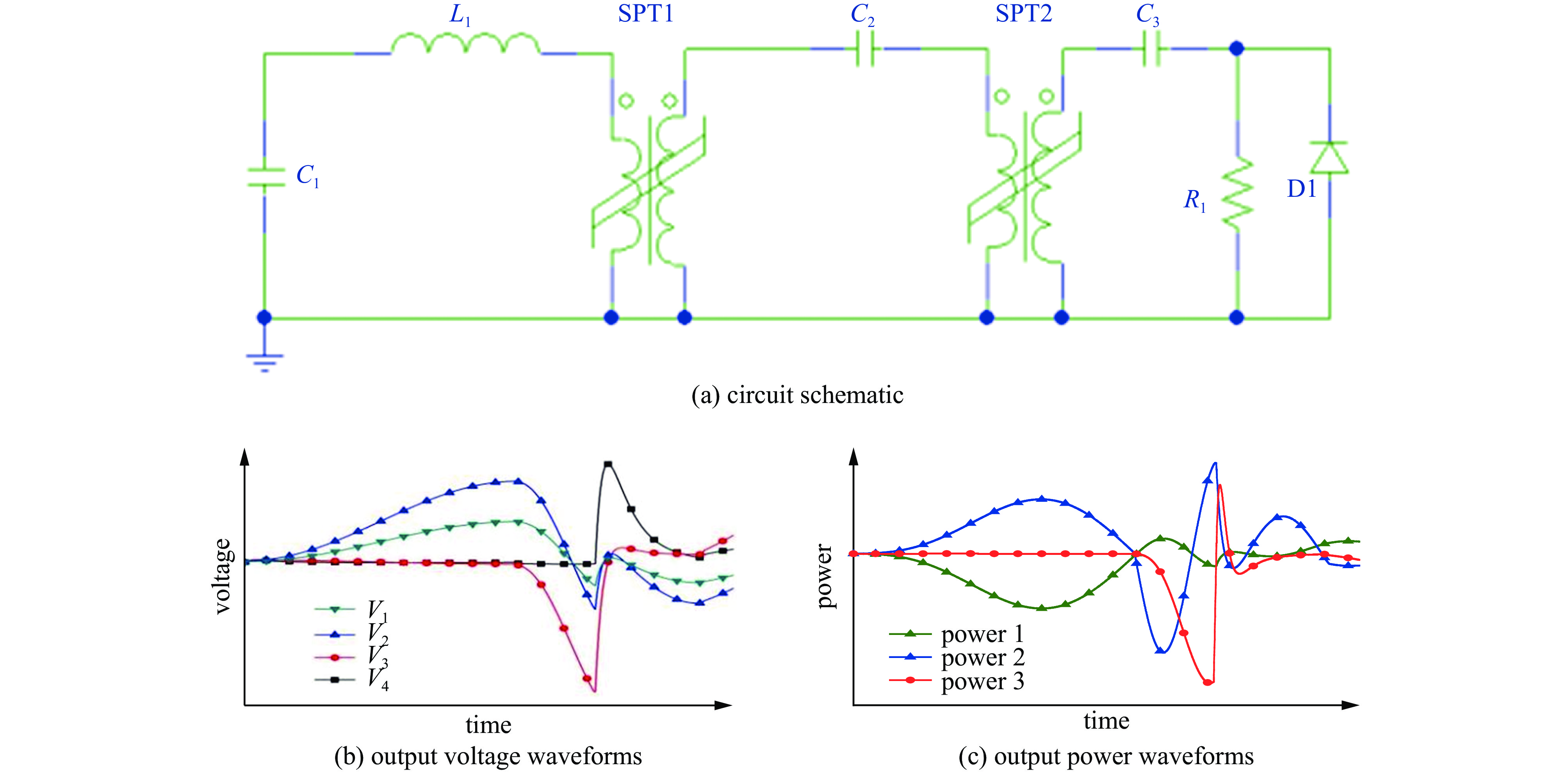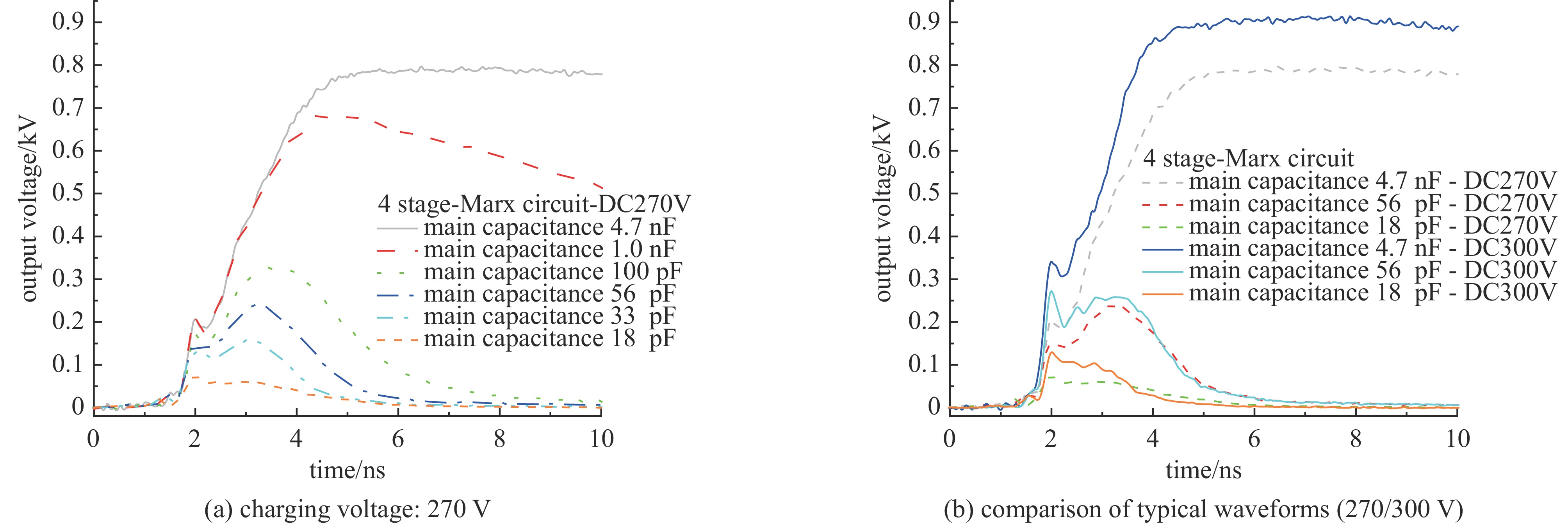 基于雪崩晶体管的Marx电路常用于产生高压纳秒脉冲,输出波形通常具有前沿时间百ps量级、指数型放电后沿、kV级输出电压等特征。然而这种电路结构的典型输出波形后沿通常存在振荡或畸变;Marx电路的储能电容较大时,波形前沿还会出现尖峰振荡;已有研究对此关注较少或将其归因于电路杂散参数、阻抗匹配的影响。从雪崩晶体管动态导通过程的角度进行了仿真分析,并对储能电容取值、Marx电路级数、充电电压等因素的影响开展了实验研究。结果表明,雪崩晶体管自身过压导通状态是引起波形振荡的关键因素;储能电容越大、Marx级数越低、充电电压越小,则振荡的现象越明显,振荡幅值甚至能够高于晶体管雪崩击穿形成的快前沿尖峰,此时快前沿尖峰即体现为波形前沿上的振荡。通过调整Marx电路储能电容大小、优化微带线结构等方式可改善输出波形振荡。