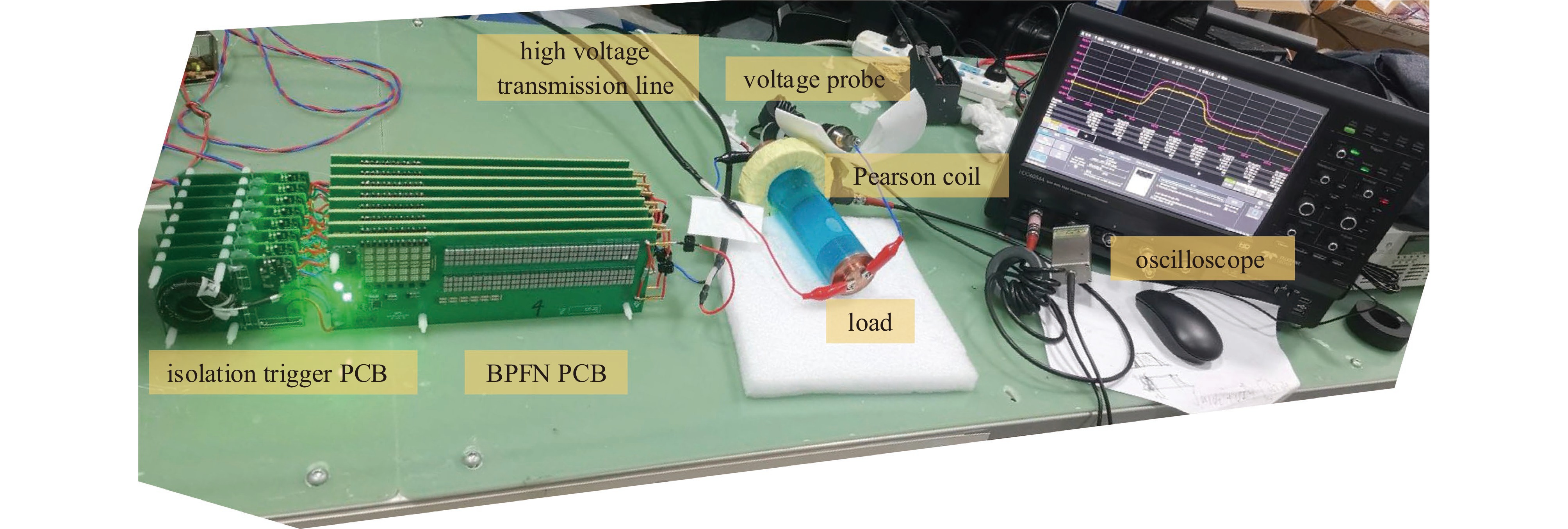 层叠Blumlein脉冲发生器具有灵活紧凑的优点,但由于开关隔离问题没有得到广泛运用。设计了一种集成隔离全固态层叠Blumlein脉冲发生器,利用4绕组共模电感为脉冲形成网络充电、驱动供电和高电压隔离的器件,解决了半导体开关应用于层叠Blumlein脉冲发生器的问题。首先介绍了隔离的原理,设计了包含共模电感和同步光触发隔离组件,以及基于IGBT开关阵列的Blumlein脉冲形成网络,分析了层叠Blumlein脉冲发生器的充放电过程;其次,对设计的Blumlein脉冲形成网络与层叠Blumlein脉冲发生器进行电路仿真;搭建了8级层叠Blumlein脉冲发生器,在匹配负载上实验得到电压30.0 kV、电流604 A、脉宽237 ns的方波脉冲。