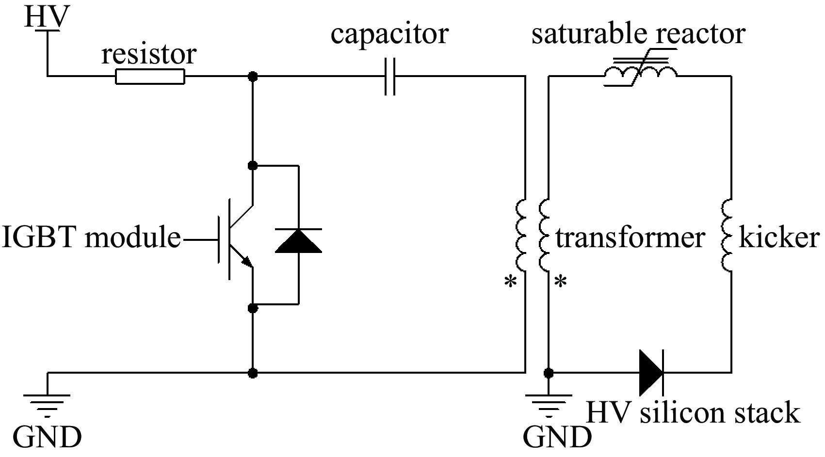 针对加速器传统闸流管半正弦冲击磁铁脉冲电源的低重频以及短寿命问题,研制了一种基于LC谐振放电的半正弦感应叠加脉冲电源。脉冲的产生由两种开关配合控制,变压器初级IGBT作为主动脉冲开启开关,次级高压硅堆作为被动脉冲关断开关,这种设计提高了有较长关断延时的大功率IGBT在窄脉冲应用的可能性。电源利用变压器磁芯饱和的特性,通过感应叠加初级二次反向谐振实现储能电容能量的自回收,降低了电路的充电时间以及热损耗。通过结合PSpice软件仿真和电路实验,研制出了一台5级叠加的脉冲电源原理样机。测试结果表明,相较于传统闸流管半正弦脉冲电源,该脉冲电源可实现更高的脉冲重复频率以及更低的功率损耗,可为加速器半正弦冲击磁铁系统提供更多设计选择方案。