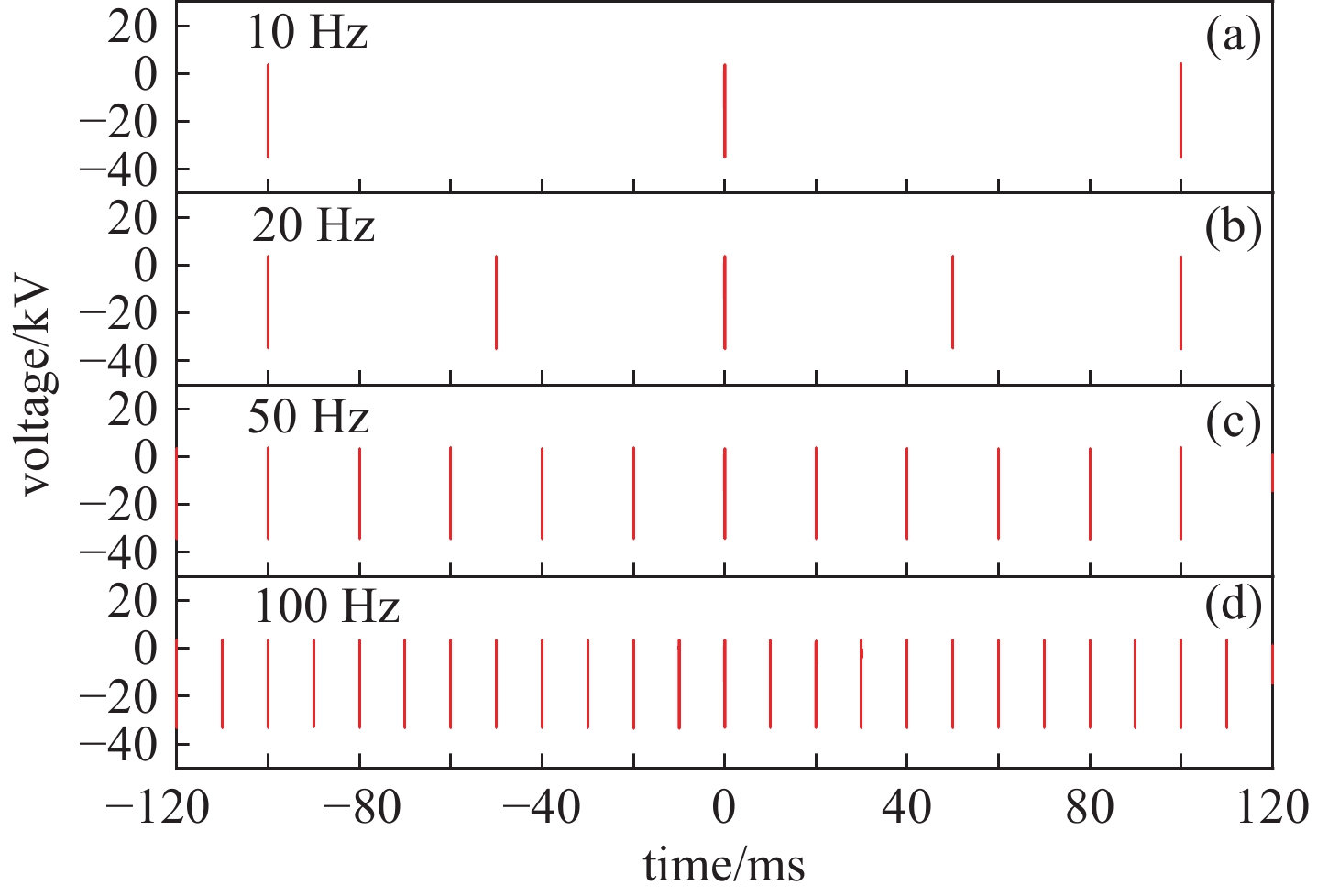 用大气压空气下的场畸变火花开关组建一套纳秒脉冲电源,研究了开关不同重复频率(从50 Hz到1300 Hz)触发击穿时的电压工作范围以及吹气的影响,用高压探头和数字示波器记录电压波形。实验结果表明,开关稳定工作(电压低于30 kV、电流峰值小于300 A)的最高重复频率为1300 Hz,因开关击穿后绝缘未完全恢复,稳定工作的最高工作电压\begin{document}$ {V}_{\mathrm{m}\mathrm{a}\mathrm{x}} $\end{document} ![]()