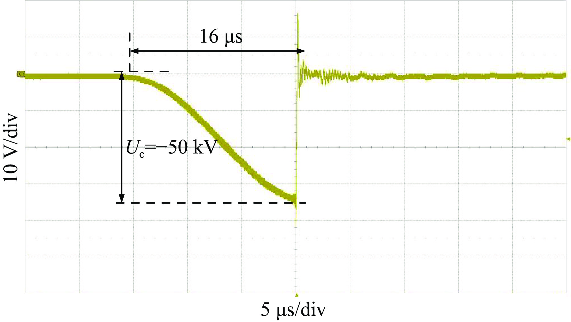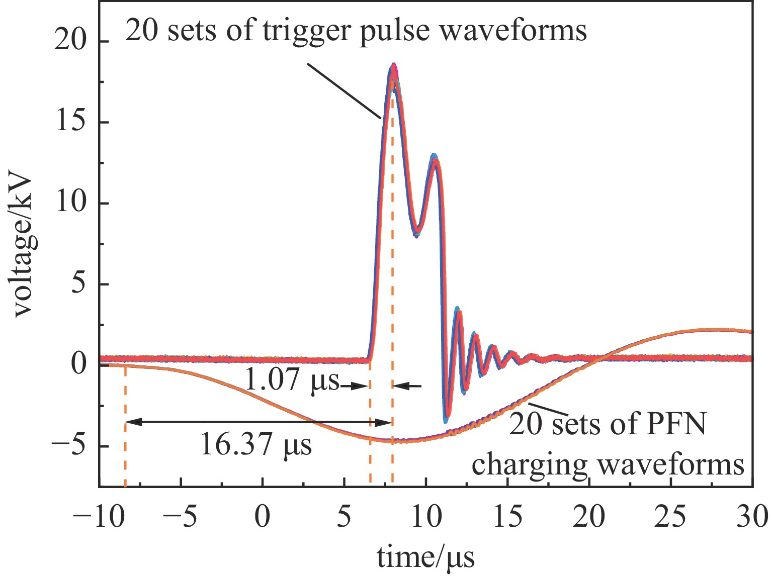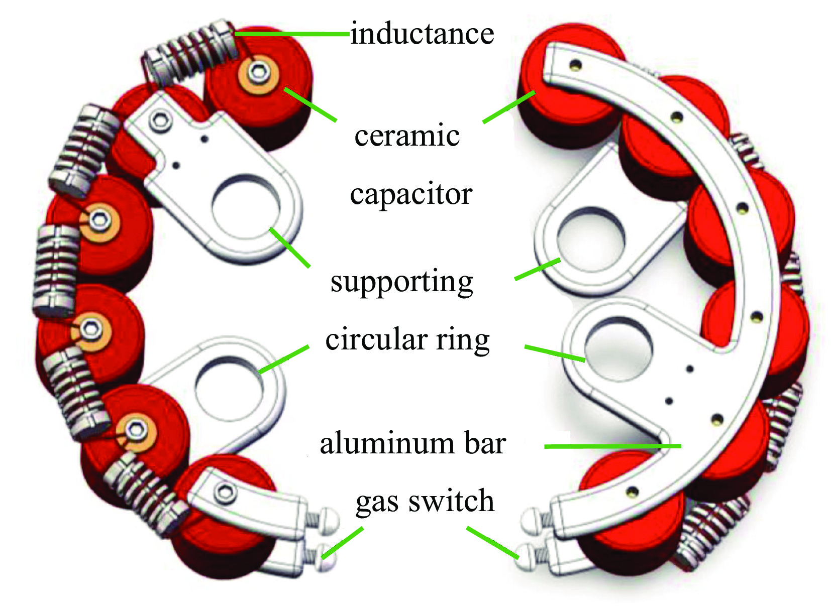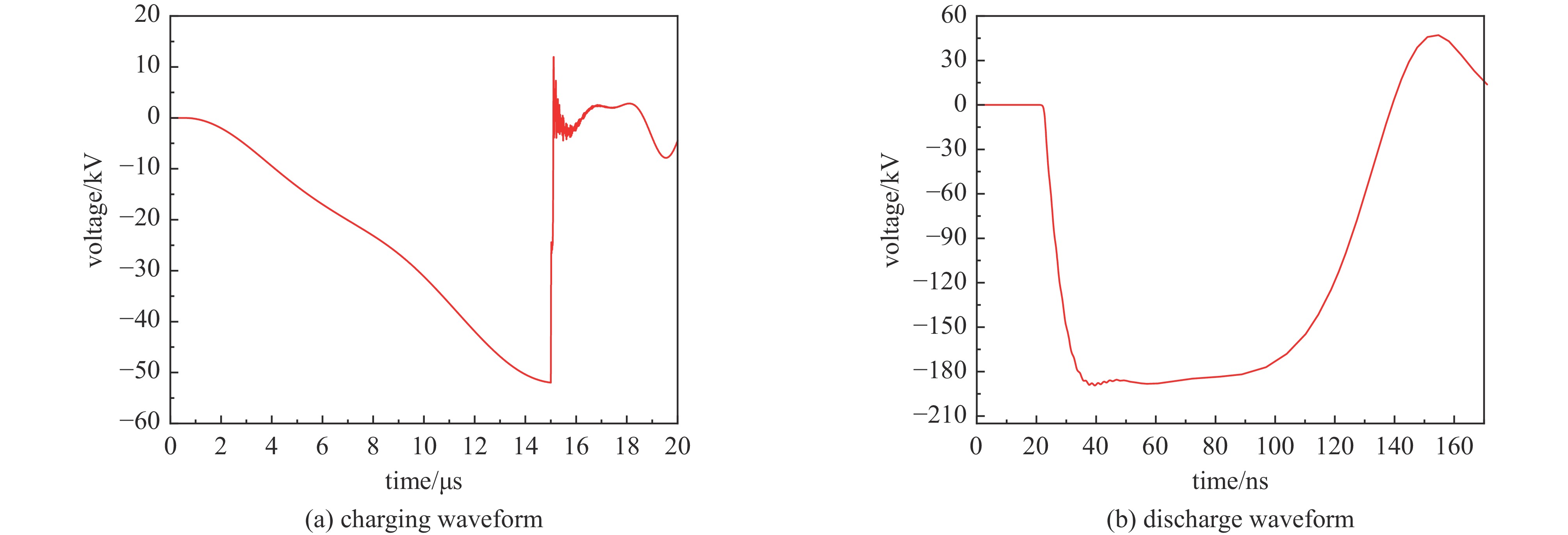为实现脉冲驱动源的紧凑化,研制了基于PFN-Marx的高功率脉冲驱动源。7级PFN-Marx采用单级性脉冲充电方式,有利于PFN-Marx内部结构以及Tesla变压器的紧凑化设计;采用锂电池供电的高功率恒流充电电源给Tesla变压器的初级电容充电,供电电源体积小且灵活可移动;PFN各级充电回路电感相同,脉冲充电波形完全同步,模块化结构设计,可以灵活增加驱动源的模块数提高输出功率。脉冲驱动源输出单脉冲能量为45.6 J,在75 Ω负载条件下输出脉冲幅值为−189.2 kV、脉宽93.2 ns、前沿为8.4 ns的准方波脉冲,功率为477 MW。锂电池充电及控制电源的体积为482 mm×443 mm×177 mm,重量为12.6 kg。Telsa变压器及PFN-Marx发生器集成化设计后的体积为ϕ370 mm×848 mm,重量为28.7 kg。此驱动源样机为更高功率更高性能脉冲驱动源的紧凑化设计提供了参考。