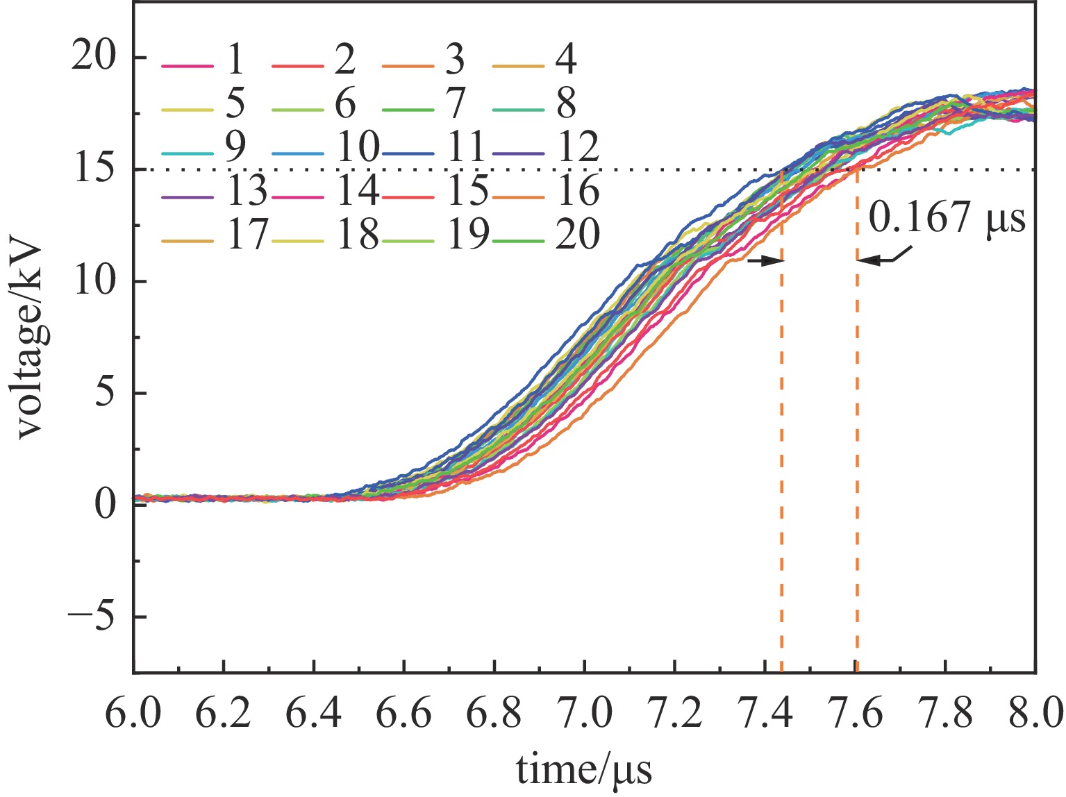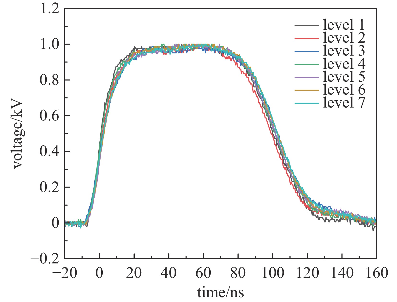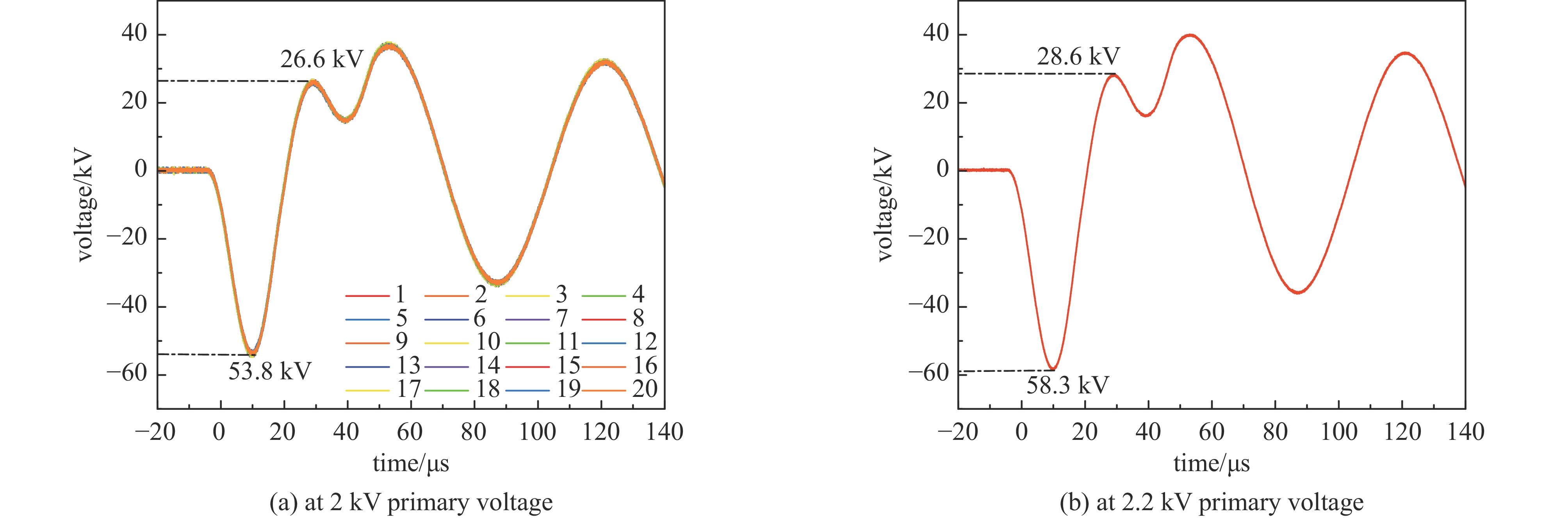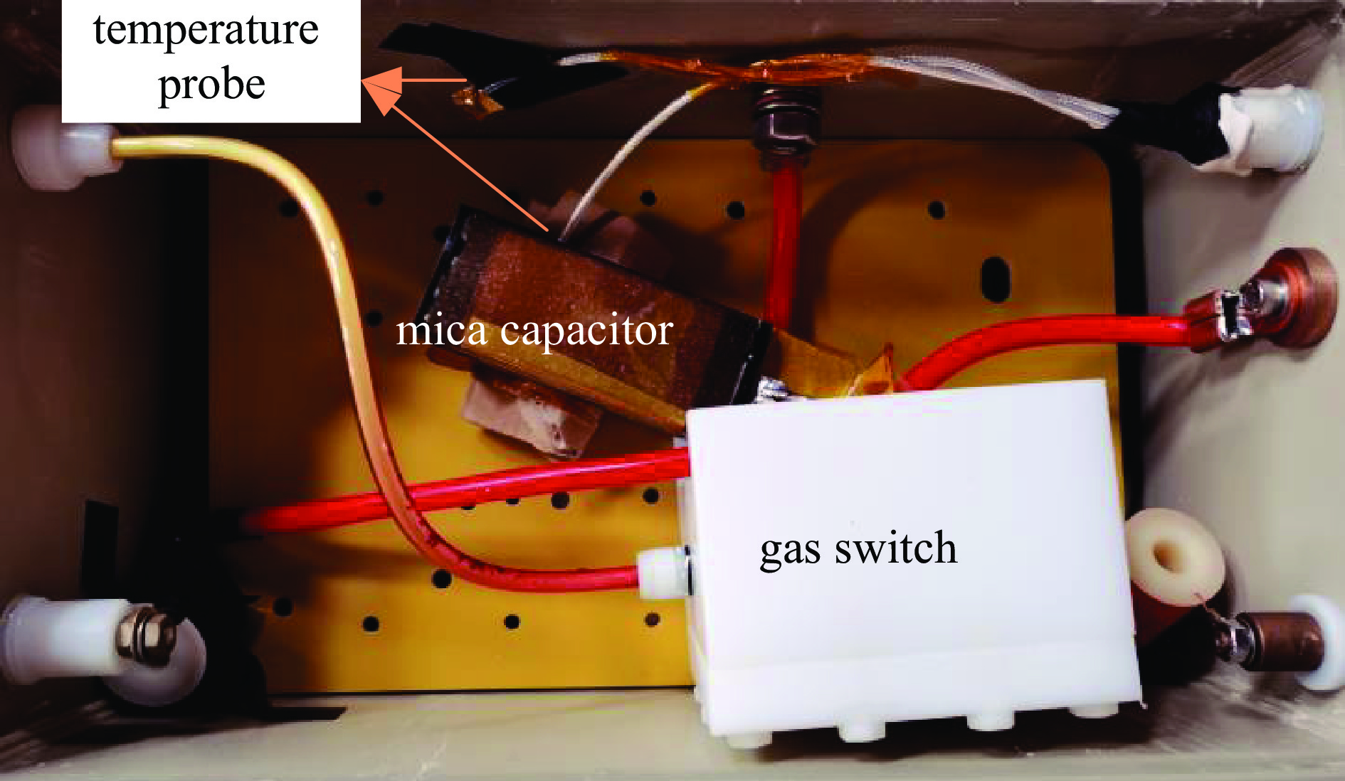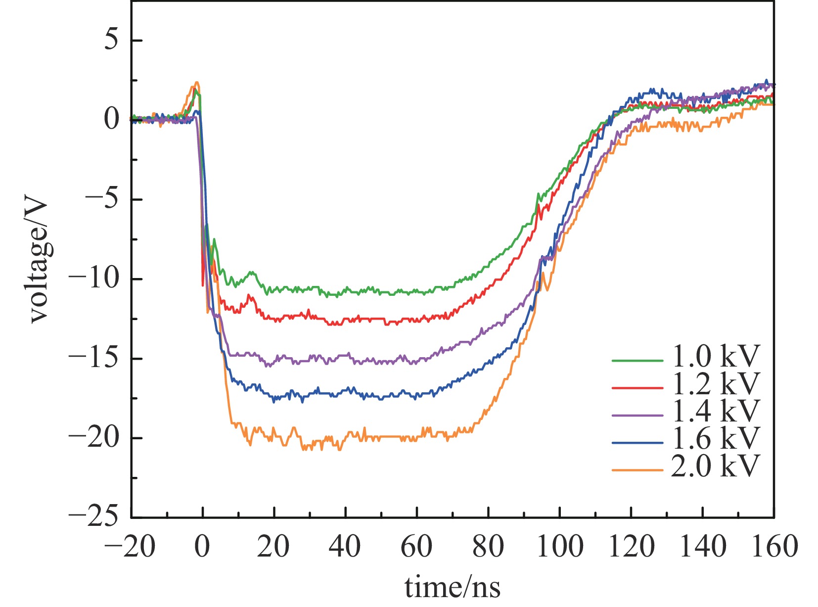为实现脉冲驱动源的紧凑化,研制了基于PFN-Marx的高功率脉冲驱动源。7级PFN-Marx采用单级性脉冲充电方式,有利于PFN-Marx内部结构以及Tesla变压器的紧凑化设计;采用锂电池供电的高功率恒流充电电源给Tesla变压器的初级电容充电,供电电源体积小且灵活可移动;PFN各级充电回路电感相同,脉冲充电波形完全同步,模块化结构设计,可以灵活增加驱动源的模块数提高输出功率。脉冲驱动源输出单脉冲能量为45.6 J,在75 Ω负载条件下输出脉冲幅值为−189.2 kV、脉宽93.2 ns、前沿为8.4 ns的准方波脉冲,功率为477 MW。锂电池充电及控制电源的体积为482 mm×443 mm×177 mm,重量为12.6 kg。Telsa变压器及PFN-Marx发生器集成化设计后的体积为ϕ370 mm×848 mm,重量为28.7 kg。此驱动源样机为更高功率更高性能脉冲驱动源的紧凑化设计提供了参考。