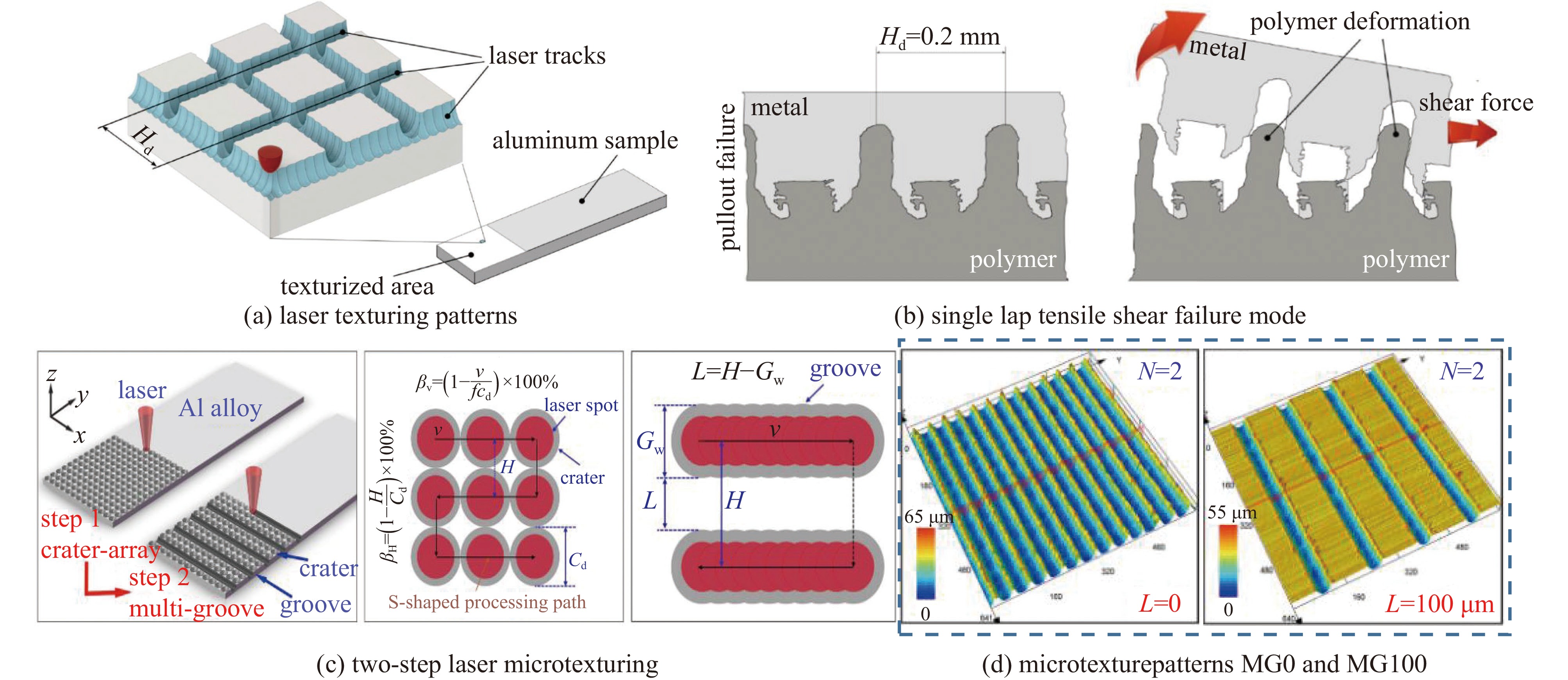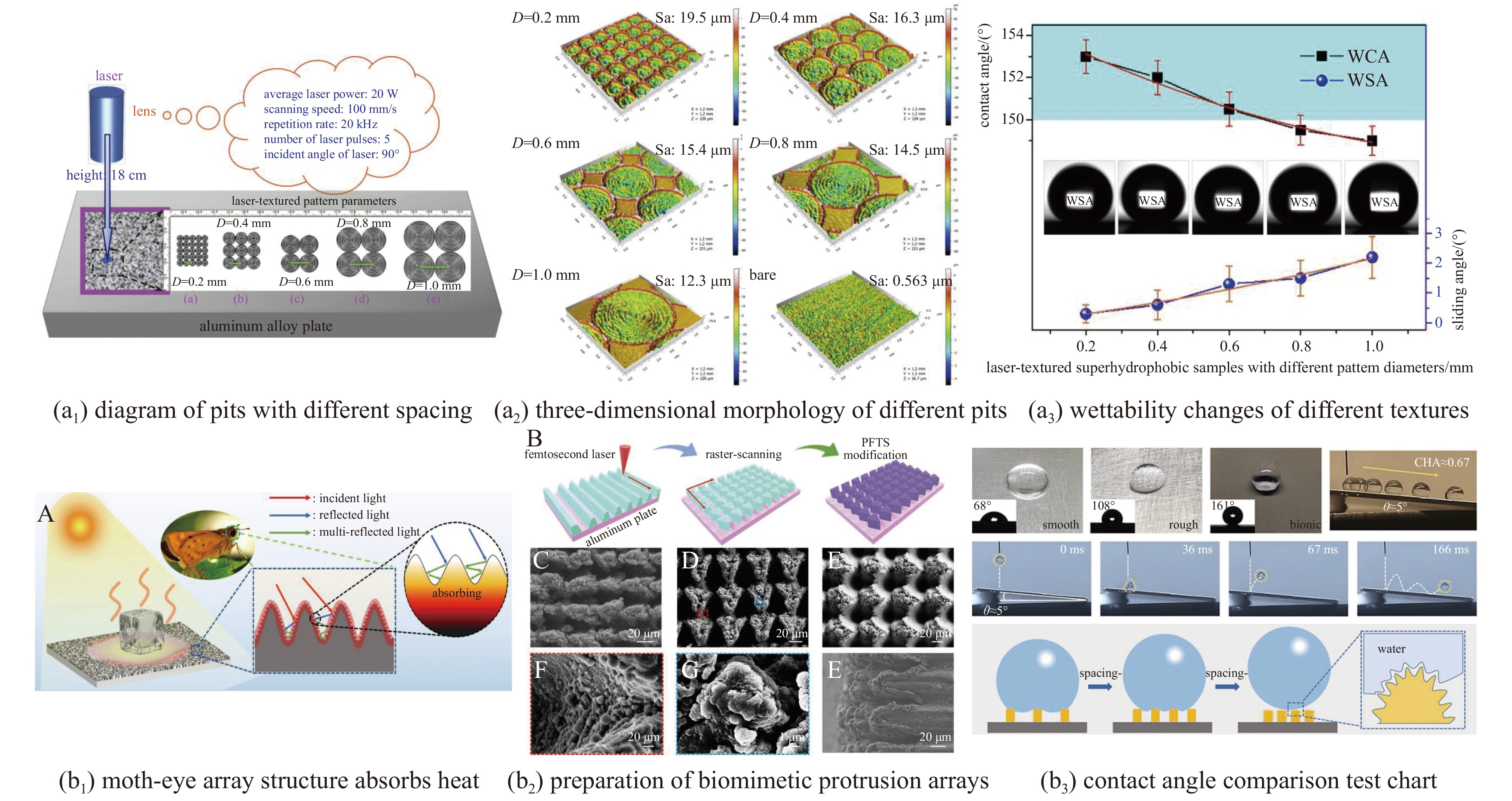作为轻量化设计的战略材料,铝合金凭借其低比重、耐腐蚀和良好的低温特性,在海洋装备、航空航天及交通运输领域中占据重要地位。值得注意的是,表面润湿特性作为铝合金功能化应用的关键界面参数,直接影响其工程服役性能。近年来,基于激光毛化织构的表面润湿性调控技术突破传统化学改性局限,为铝合金表面功能化提供了新的思路。系统阐释了润湿性基础理论体系,包括Young氏模型、Wenzel模型和Cassie-Baxter模型,分析了超短脉冲激光和长脉冲激光体系在铝合金表面仿生功能化构建中的应用差异,其中超短脉冲激光(飞秒/皮秒)凭借其极短脉宽和超高峰值功率的特性可实现亚微米级精密织构,而长脉冲激光则在大面积加工效率方面具有优势。研究显示,此类功能化表面在表面自清洁、低温防覆冰、耐Cl−腐蚀、高效沸腾传热、粘接及微流控等领域展现出显著优势,然而其实际应用仍受限于润湿稳定性衰退和环境耐受性不足等关键技术瓶颈。