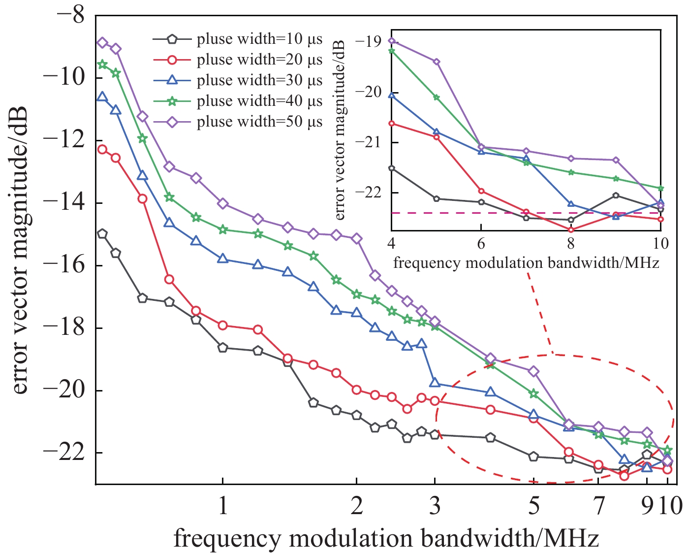 高功率雷达广泛应用于国防、监视和航空航天等重要领域,但其较高的峰值功率和宽频谱特性可能对邻近频段的通信系统造成非预期的干扰。其中,线性调频(LFM)信号是高功率雷达最常用的信号形式,因此,开展LFM信号对通信系统的干扰特性研究具有重要意义。为明确LFM信号关键波形参数对正交相移键控(QPSK)调制通信系统的干扰效应并揭示其干扰规律,基于软件定义无线电(SDR)搭建QPSK调制通信系统,以误差矢量幅度(EVM)为统一度量指标,定量分析了脉宽、脉冲周期和调频带宽三个关键波形参数对QPSK调制通信系统的干扰影响。结果表明:线性调频脉冲的占空比增大会显著提高EVM值,但当占空比超过30%后,EVM增速趋于稳定;在相同占空比条件下,脉冲周期变化对通信系统EVM的影响不显著;调频带宽从1 MHz增至3 MHz时,通信系统的EVM由−10.5 dB降至−19.8 dB,降幅达9.3 dB;进一步将带宽由3 MHz增加至10 MHz,EVM基本保持恒定。基于SDR平台搭建了高功率微波(HPM)雷达信号对通信系统干扰的定量分析实验系统,开展了多波形参数条件下的干扰测试与分析,揭示了LFM信号对QPSK调制通信系统的潜在影响,为雷达与通信频谱共存及通信系统抗干扰设计提供了实验依据与理论支撑。