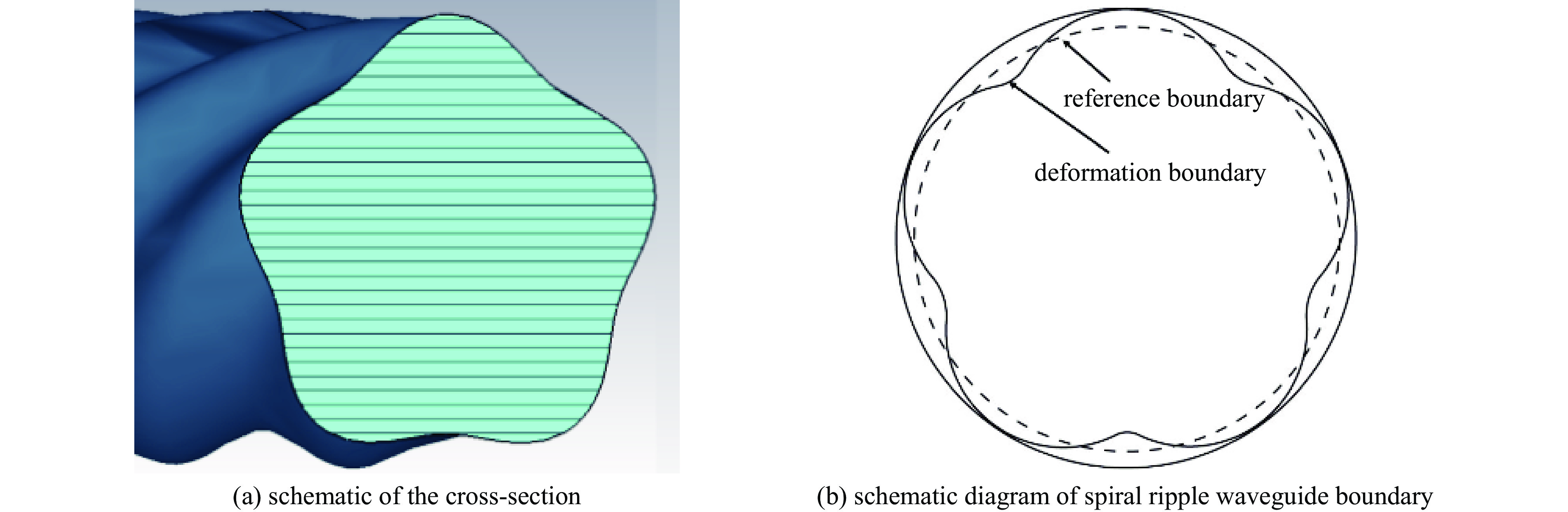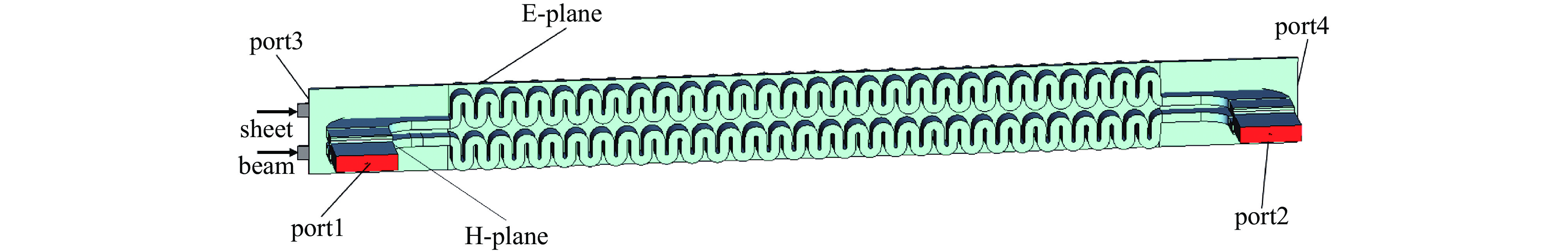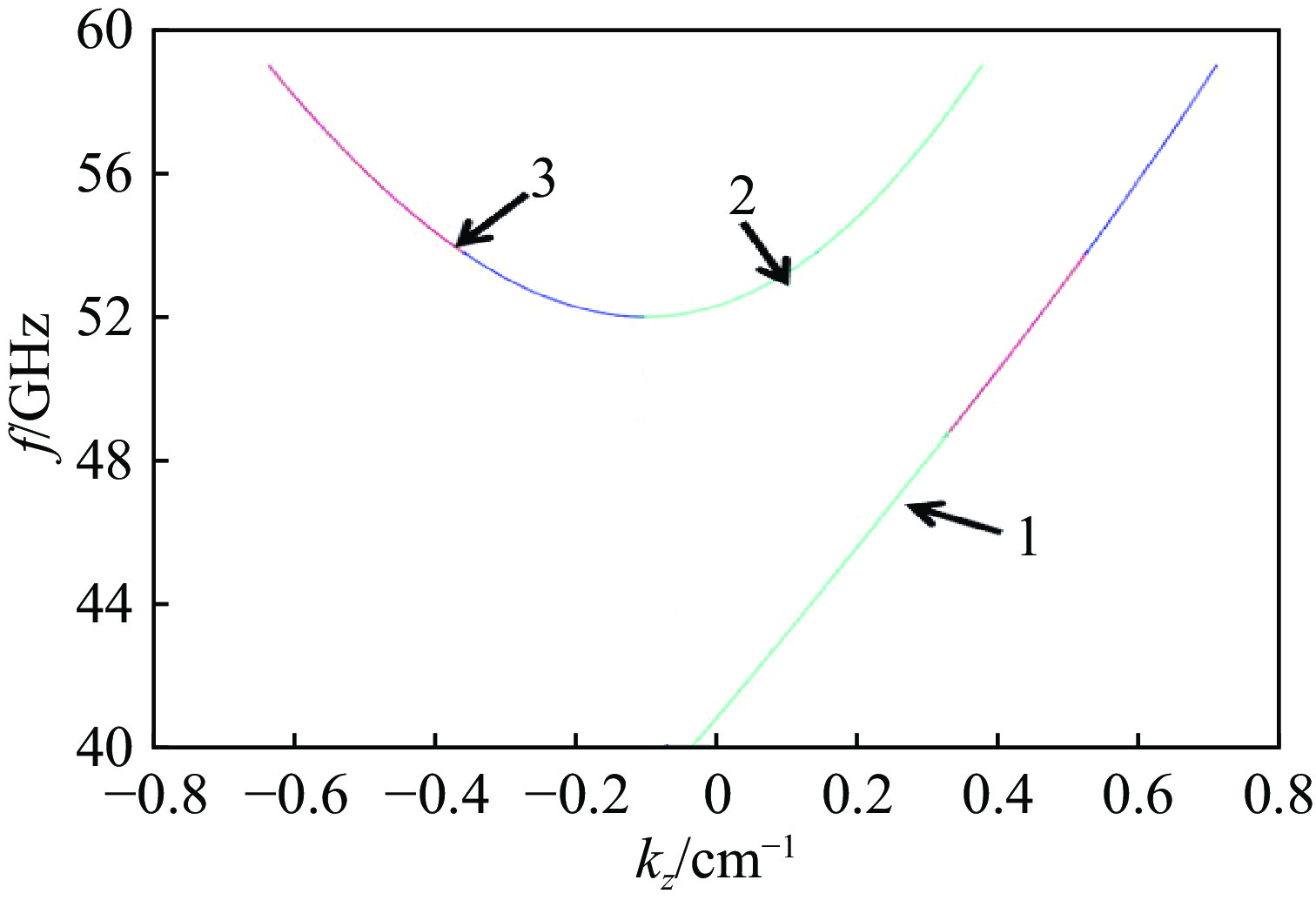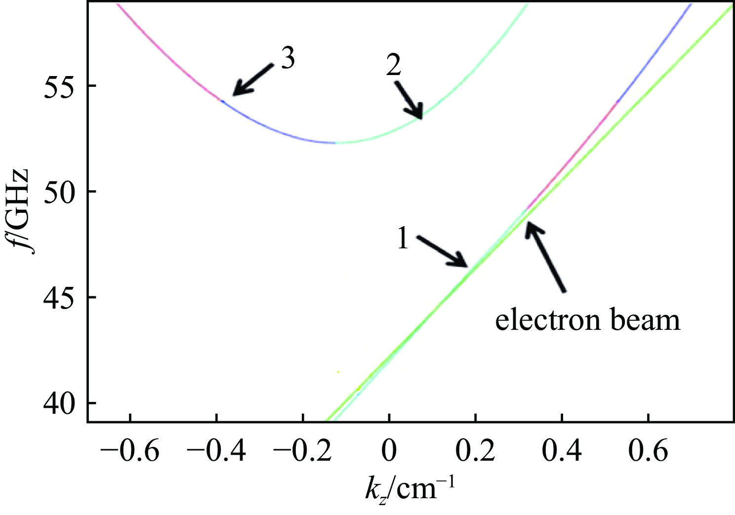 的模式相互作用,其中,s为谐波次数,m为模式的角向指标,利于模式竞争的抑制。为了研究螺纹起伏参数和螺纹周期的改变对于工作模式1曲线的影响,本文利用阻抗微绕法,通过波耦合方程,得到五折叠Q波段螺旋波纹波导的传输耦合方程,分析了五折叠Q波段螺旋波纹波导模式耦合规则,并给出其色散方程,对色散方程进行数值求解,得到五折叠Q波段螺旋波纹波导的色散曲线,通过分析色散特性可知,在波导中有3个本征模式,模式1和2、3基本完全分离,选取模式1为工作模式,在42~47 GHz的范围内和电子注模式可以在较宽的范围内相切,不仅极大地拓展了互作用带宽,还可抑制模式竞争。