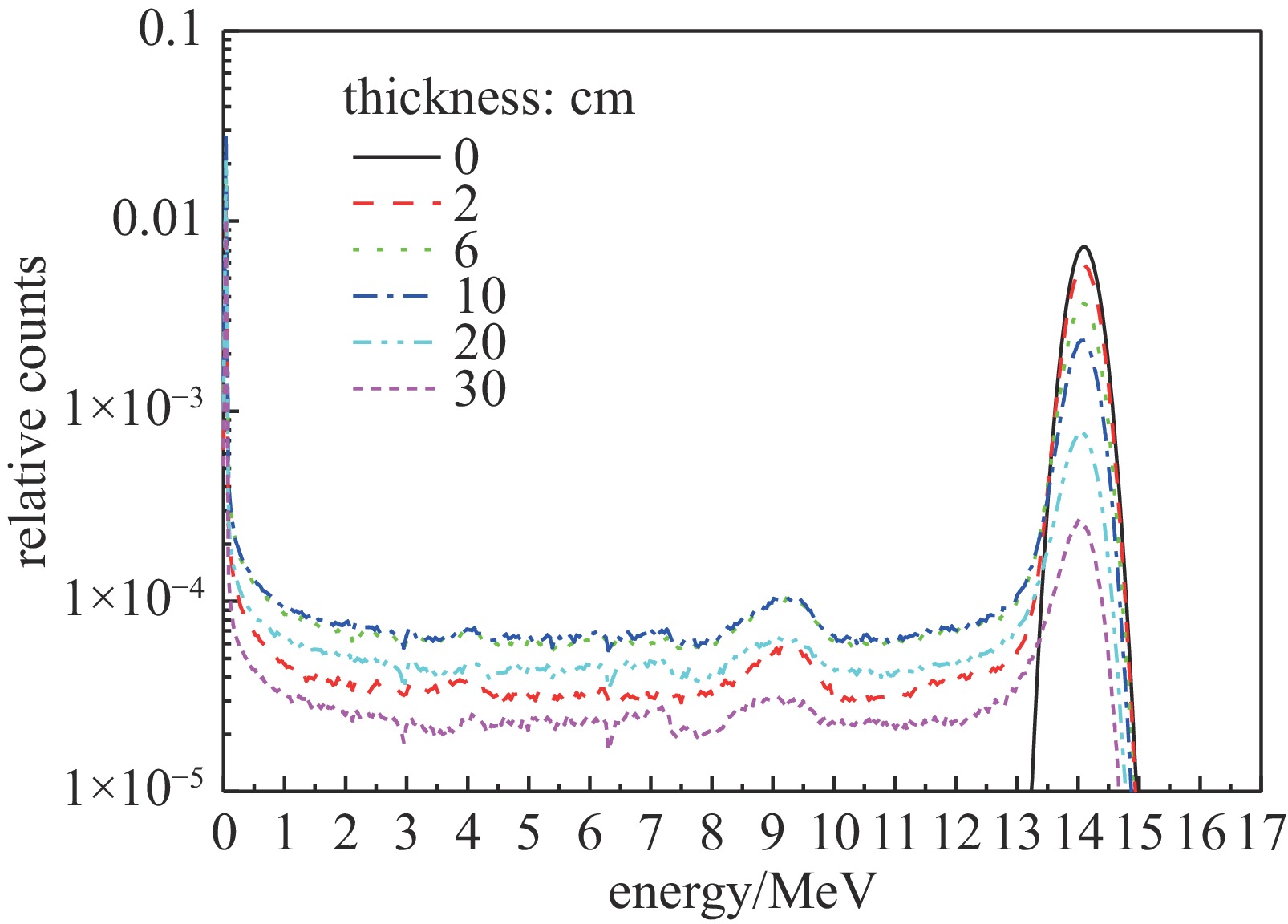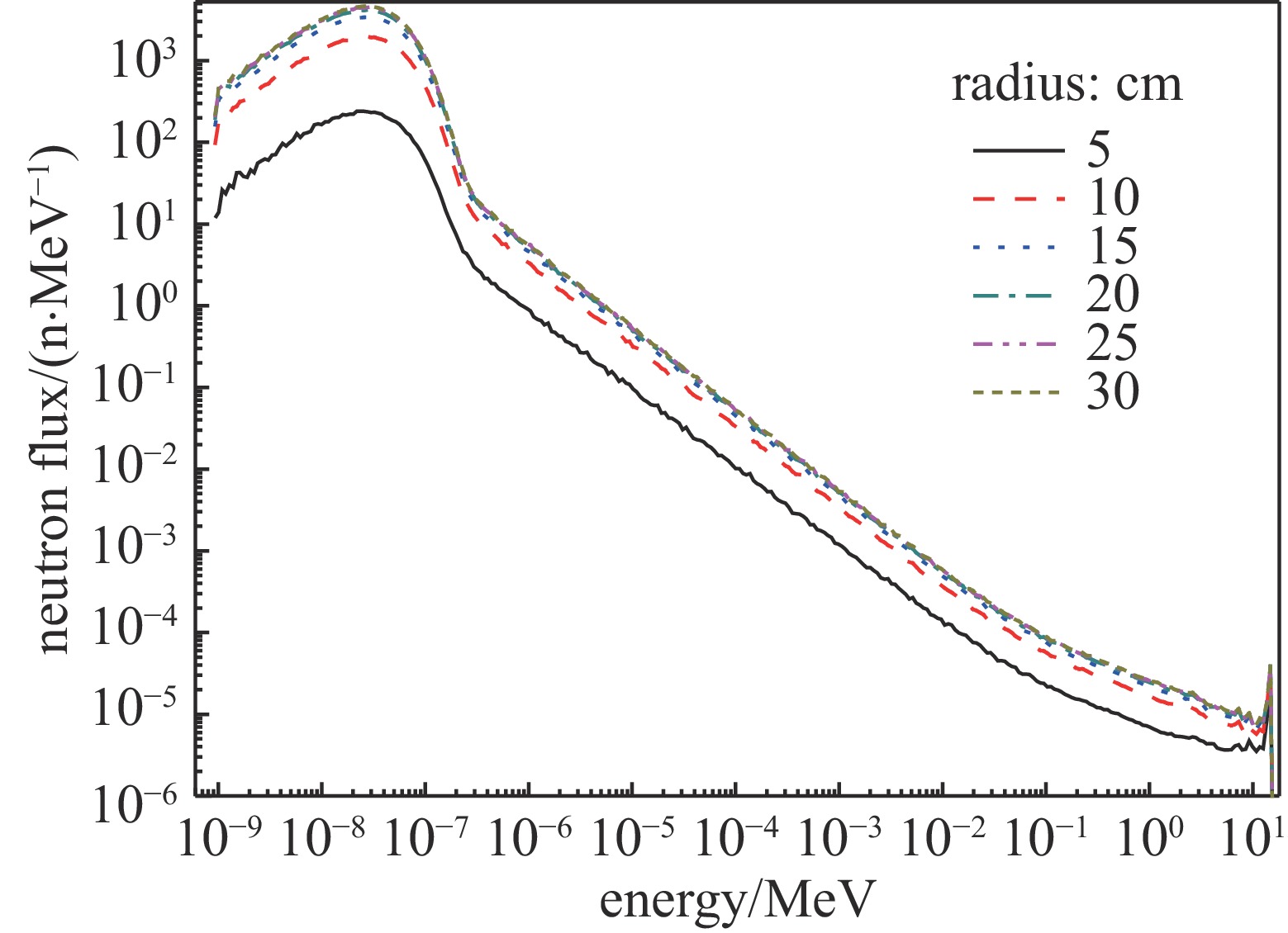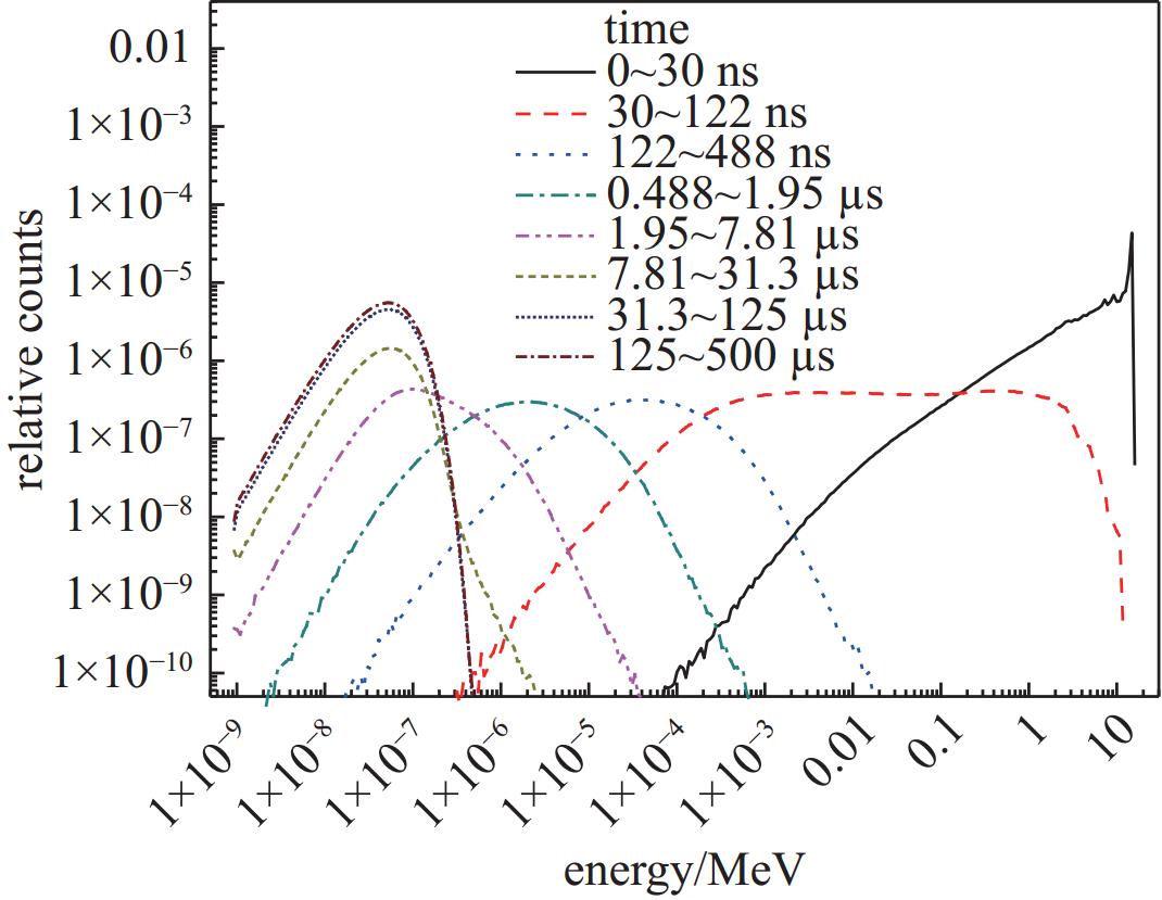 针对长计数器基本结构,建立简化模型系统模拟了快中子脉冲经慢化体后进入正比管的能谱分布与时间分布,结果表明:中子能谱随时间的演化明显,31 μs以后,中子的能谱变化变小,趋于恒定;进入正比管的不同能量的中子时间分布不同,随着能量变低,时间分布变宽,热中子附近,时间分布可持续至上千μs;利用不同能量中子随时间的分布,计算了长计数器计数随时间的变化。慢化体半径超过20 cm后,进入正比管的中子通量与能谱基本不随慢化体半径变化而变化,此结果可为长计数器尺寸的优化设计提供参考。