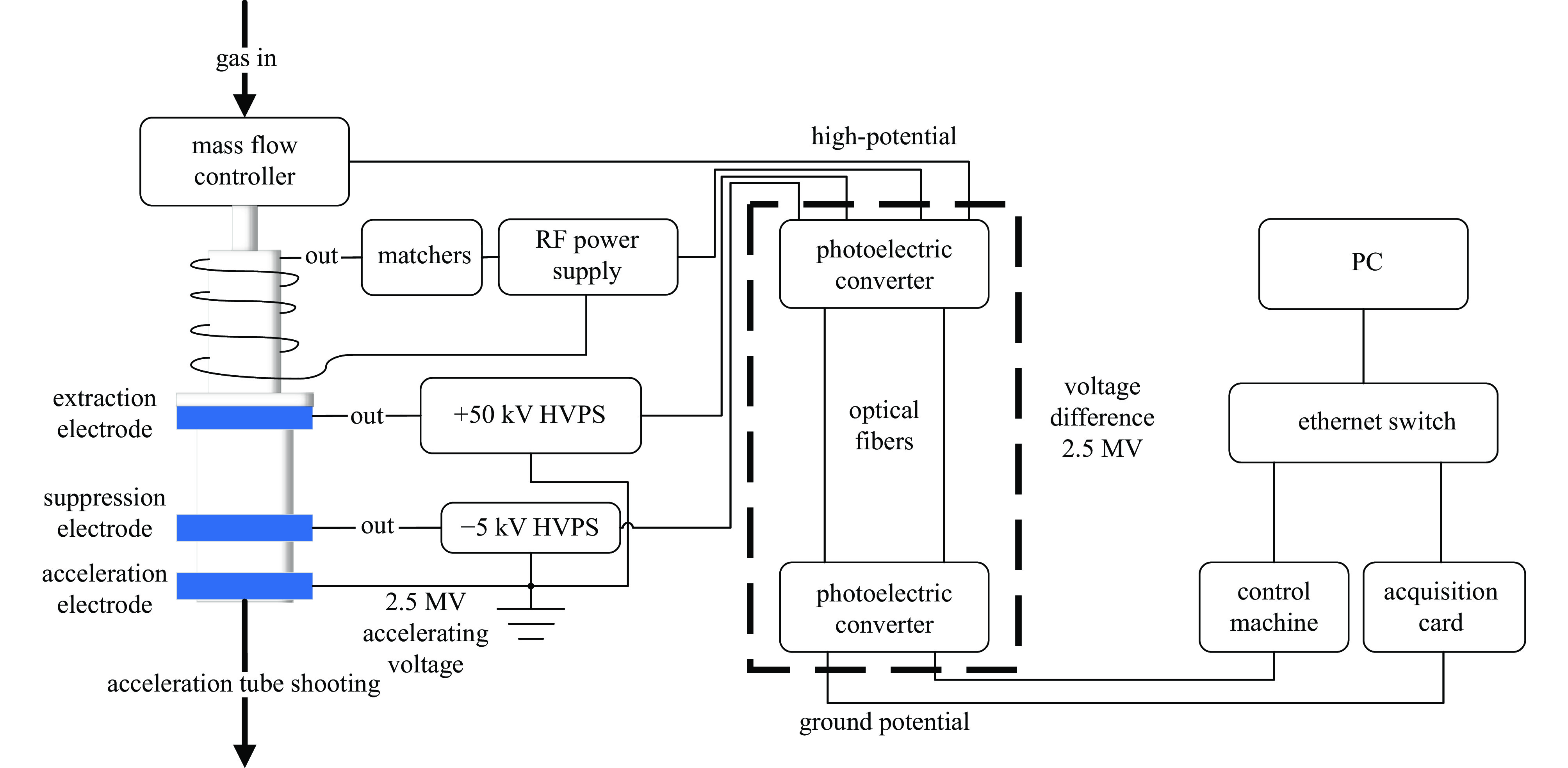 直流高压加速器离子源系统需在兆伏级高压平台运行,有线通信介质如光纤在紧凑型使用工况下由于耐压局限性而存在击穿风险。为此,设计并研制了一种基于无线光通信(WOC)的离子源控制与采集系统样机,针对2.5 MV直流高压加速器中电感耦合等离子体(ICP)离子源系统中的高压电源、射频电源和质量流量计所需的模拟量控制与采集要求,采用差分输入模数转换(ADC)对控制与采集原始信号进行采样,经数字处理后通过无线光通信传输;无线光信号通过光电转换,再经数模转换(DAC)和放大电路重构原始信号。通过搭建离线测试平台,验证所设计的无线光系统能够稳定控制直流高压加速器离子源系统相关设备。实验测试结果表明,该无线光系统满足硼中子俘获治疗(BNCT)项目的技术要求,具备在2.5 MV直流高压加速器离子源系统中应用的可行性。