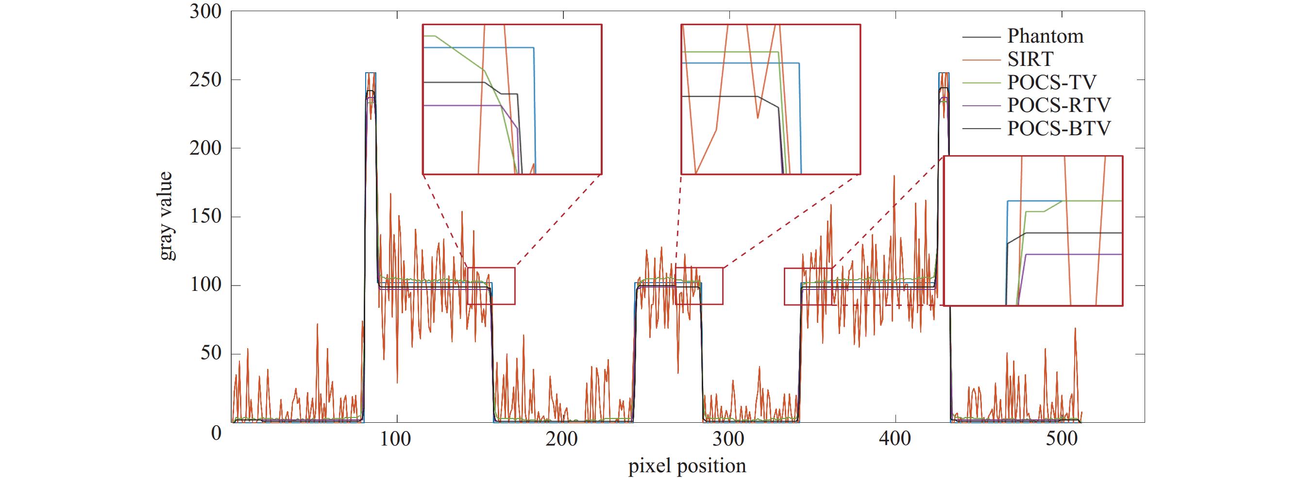 Rhodotron加速器因其微焦点特性,为工业计算机断层扫描(CT)系统实现高空间分辨率检测提供了硬件基础。然而,在检测航空航天等领域常用的高密度、大尺寸工件时,X射线的强衰减会导致投影数据信噪比严重降低,常规重建算法难以兼顾噪声抑制与细节保持,限制了系统分辨能力的发挥。针对此问题,旨在提出一种能够在强噪声背景下实现高保真重建的算法。本研究提出一种基于双边总变分正则化凸集投影(POCS-BTV)的高分辨迭代重建算法。该算法在POCS框架内,创新性地引入具有优越边缘保持能力的BTV作为正则项,通过迭代优化有效分离图像结构与噪声。通过仿真实验和基于Rhodotron加速器CT系统的实际物理模体实验对算法性能进行验证,并与SIRT、POCS-TV及POCS-RTV等算法进行对比。仿真实验结果表明,所提POCS-BTV算法重建的Shepp-Logan头模图像峰值信噪比(PSNR)达到30.76,结构相似性(SSIM)为