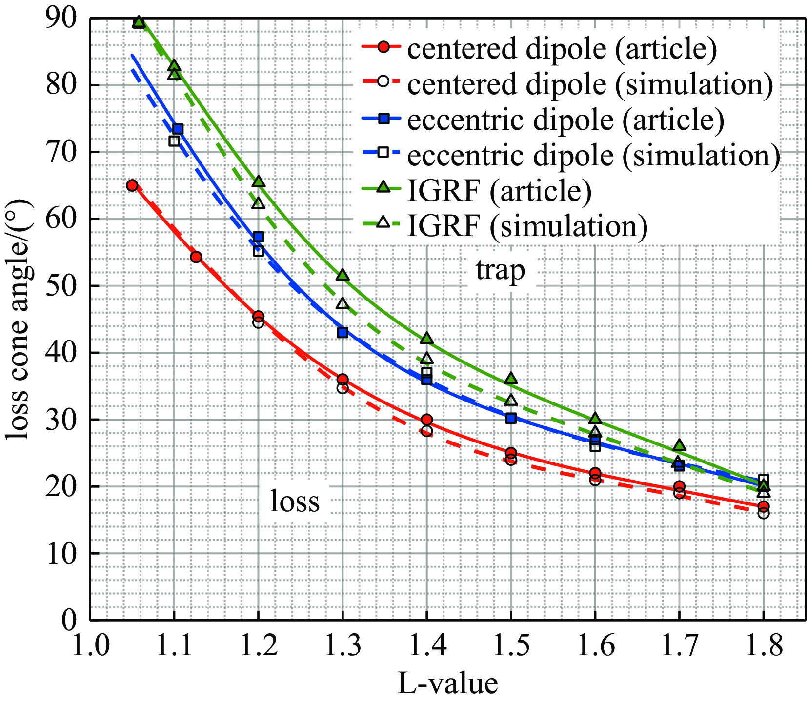 以蒙特卡罗软件Geant4中的MAGNETOCOSMIC程序为基础,通过计算模拟不同地磁场模型和地理位置发射时的粒子损失过程,探讨了地球磁场对人工辐射带中粒子运动和俘获的影响规律。首先,模拟了10 MeV电子在不同经度和L值(L是赤道面上的空间映射点距地心距离与地球半径的比值)下的发射,分析了在中心偶极子、偏心偶极子和国际地磁参考场(IGRF)三种地磁模型下电子的运动轨迹、损失锥角和俘获条件。结果显示:中心偶极子模型中电子的漂移轨迹相对规则且对称,而偏心偶极子模型则出现了不对称性,而 IGRF 模型则因其更精细的参数和更高的精度,展现了更复杂、不规则且更接近实际的轨迹;损失锥角随L值的变化关系中,IGRF模型下损失锥角最大,电子更难被地磁场俘获。其次,探讨了电子发射经度对损失过程的影响,尤其是在南大西洋异常区(SAA区)的损失过程。结果表明,当电子运动到靠近SAA中心的位置时会更容易发生漂移损失。