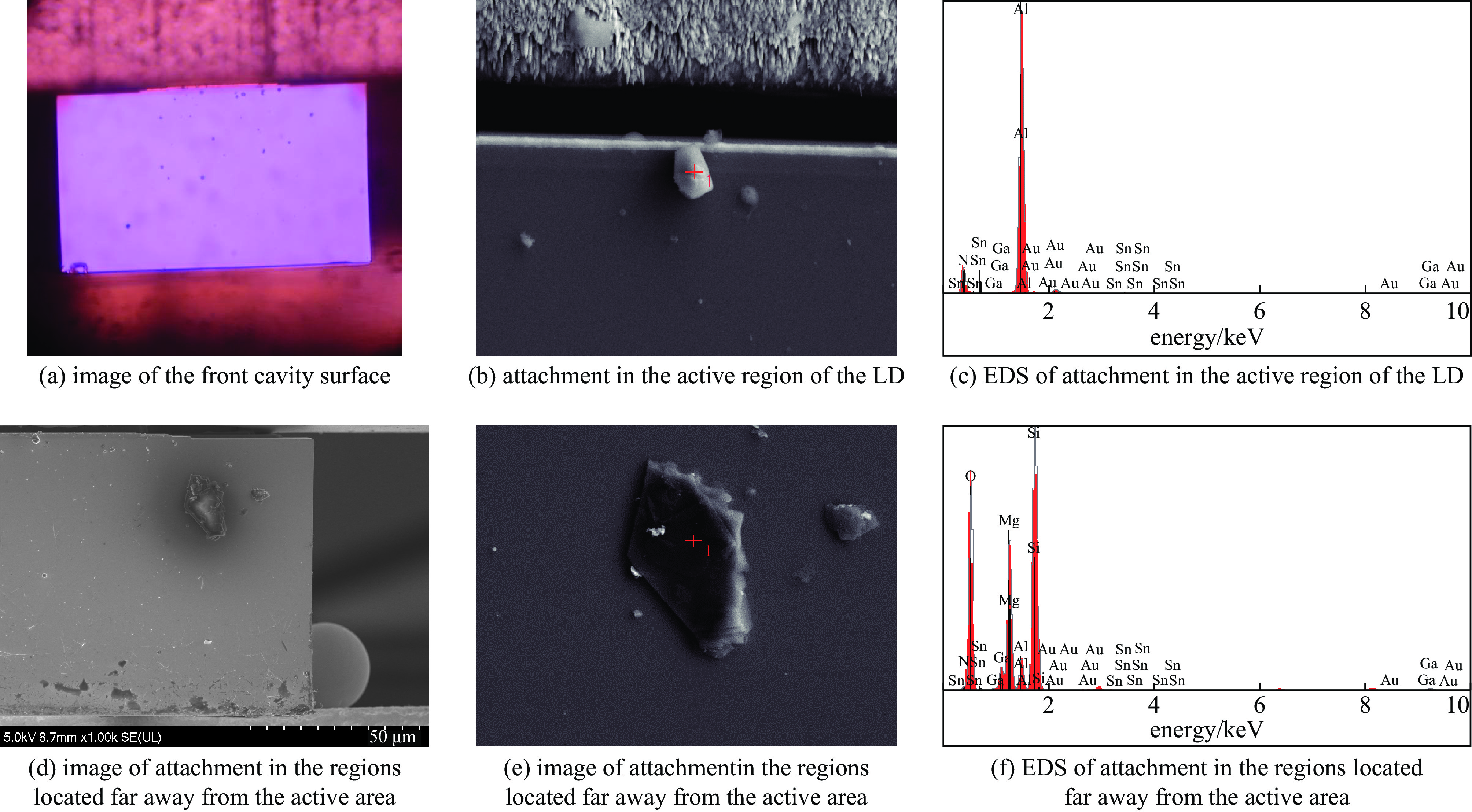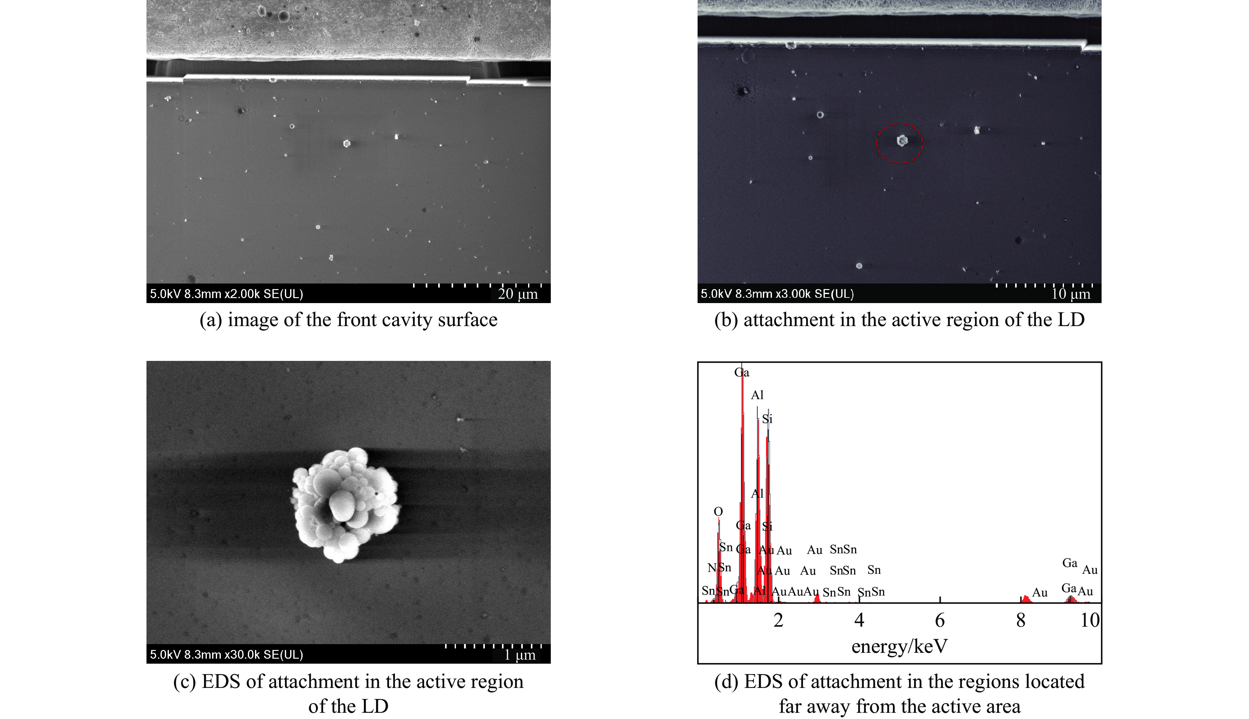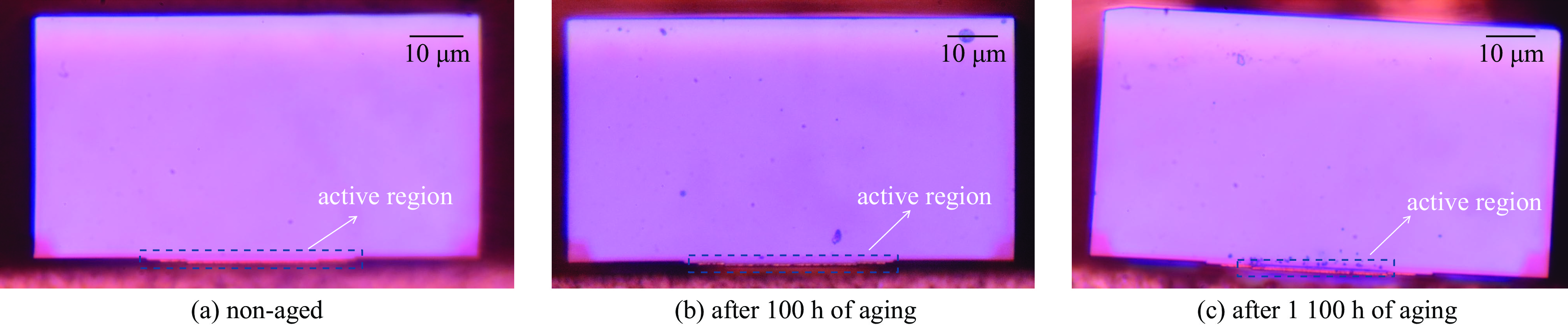 高功率GaN基蓝光二极管激光器在工业加工、铜材料焊接、3D打印和水下激光通信等技术领域有着广泛的应用前景。蓝光二极管激光芯片COS单元器件具有热阻低和尺寸小的优点,但是该器件存在可靠性较低的问题,导致其在工业化应用中受到一定限制,因此对其性能退化因素进行深入研究。基于光学显微技术、扫描电子显微表征和能谱分析手段对经过长时老化考核后器件的性能退化因素进行分析研究。实验研究和分析表明,GaN基体材料缺陷、腔面多余物沉积和光化学腐蚀是导致蓝光二极管激光芯片性能退化的主因,同时良好的气密性封装可提高二极管激光芯片的可靠性。