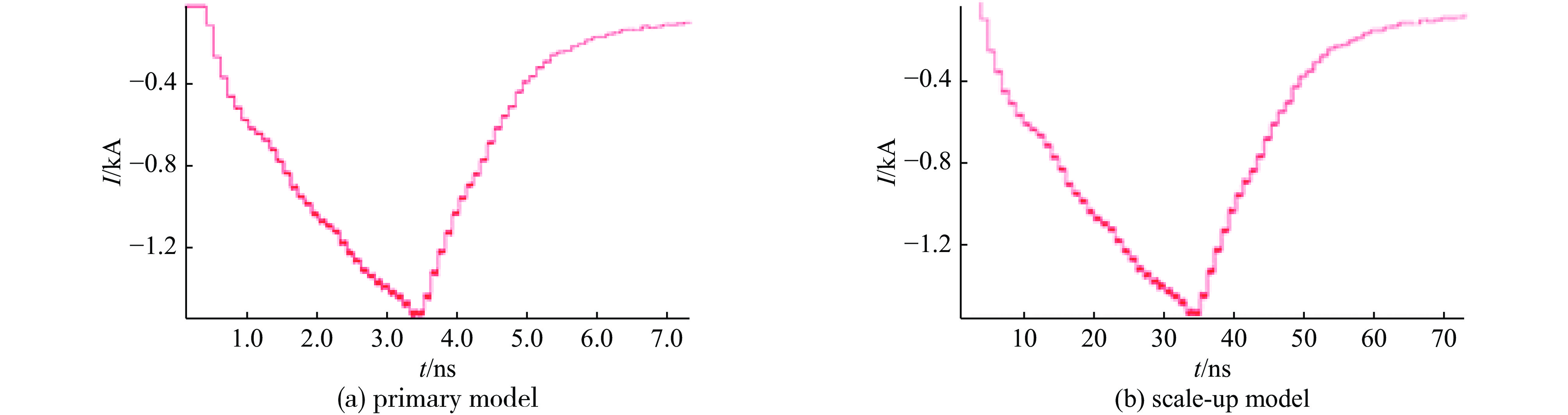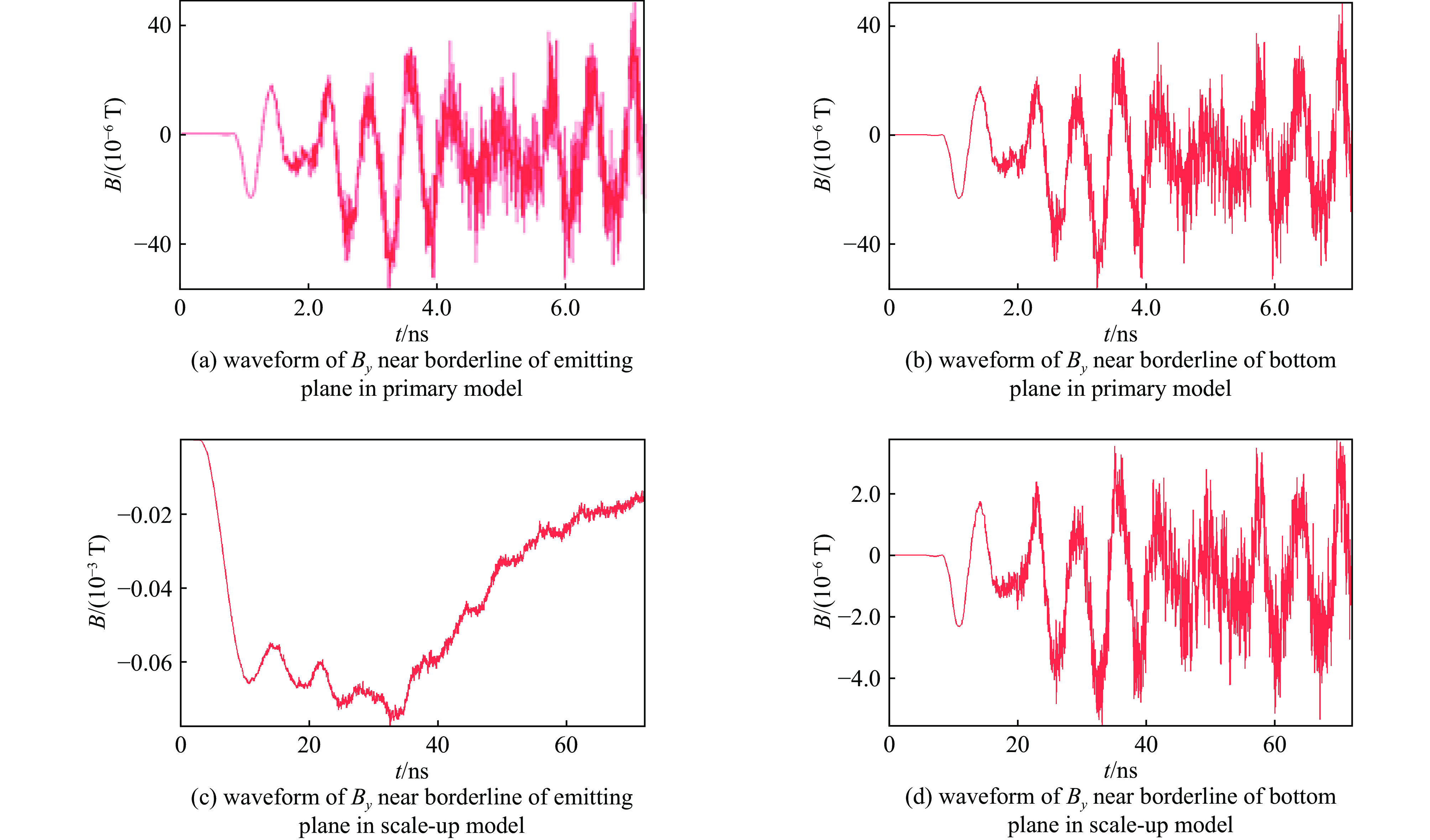 研究系统电磁脉冲(SGEMP)的定标理论,掌握SGEMP的定标法则,并将其应用于腔体SGEMP,提出保持腔壁材料厚度不变的规范变换方法,应用全电磁粒子模拟方法方法进行数值模拟研究,通过对比实验室激光等离子体源条件下的原模型与10倍扩比模型的模拟结果,发现两者在电场、磁场及电荷密度的空间分布规律上呈现严格一致性,幅值大小完全遵循定标关系:发射端面表面电场峰值原模型为2.0 MV/m,扩比模型为200 kV/m;磁场峰值原模型为0.8×10−3 T,扩比模型为0.8×10−4 T;电荷密度峰值原模型为6.0×10−3 m−3,扩比模型为6.0×10−5 m−3。模拟结果验证了定标法则应用于腔体SGEMP的有效性。该研究为腔体SGEMP的物理机制解析及实验室模拟实验设计提供了理论依据。