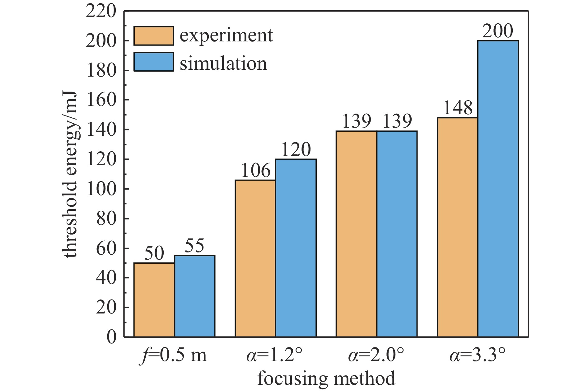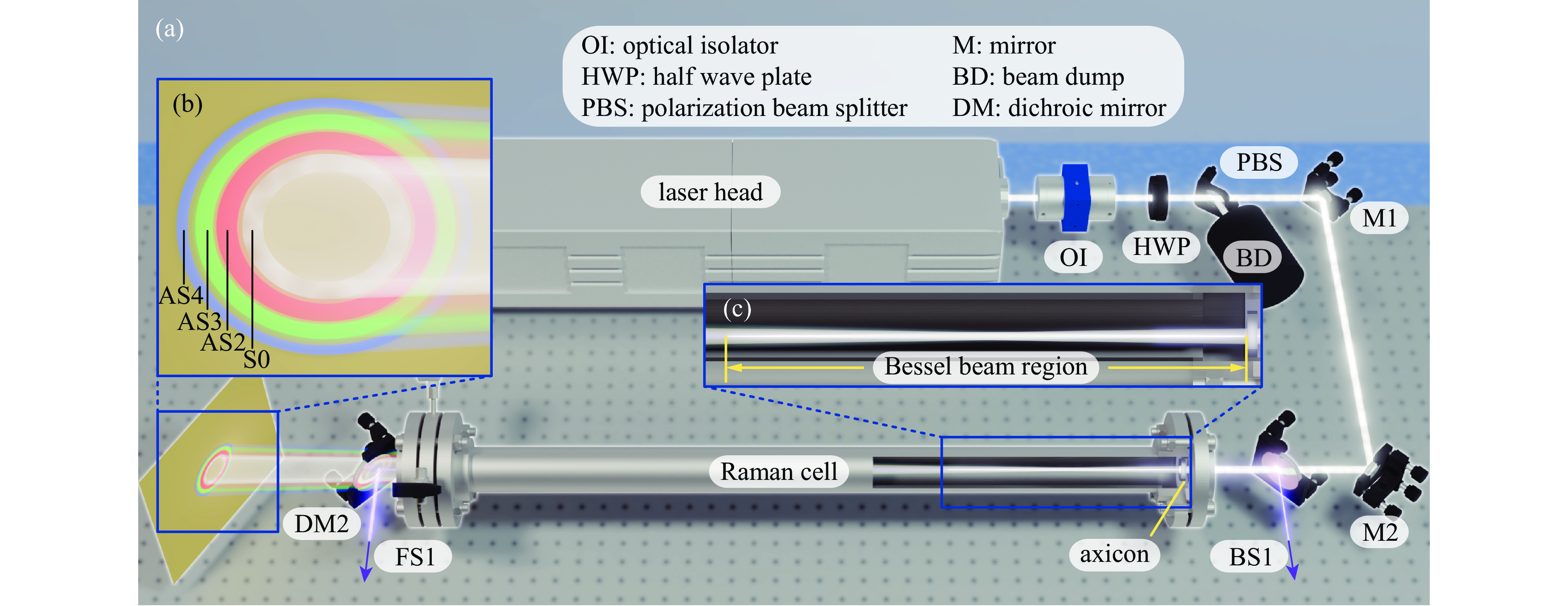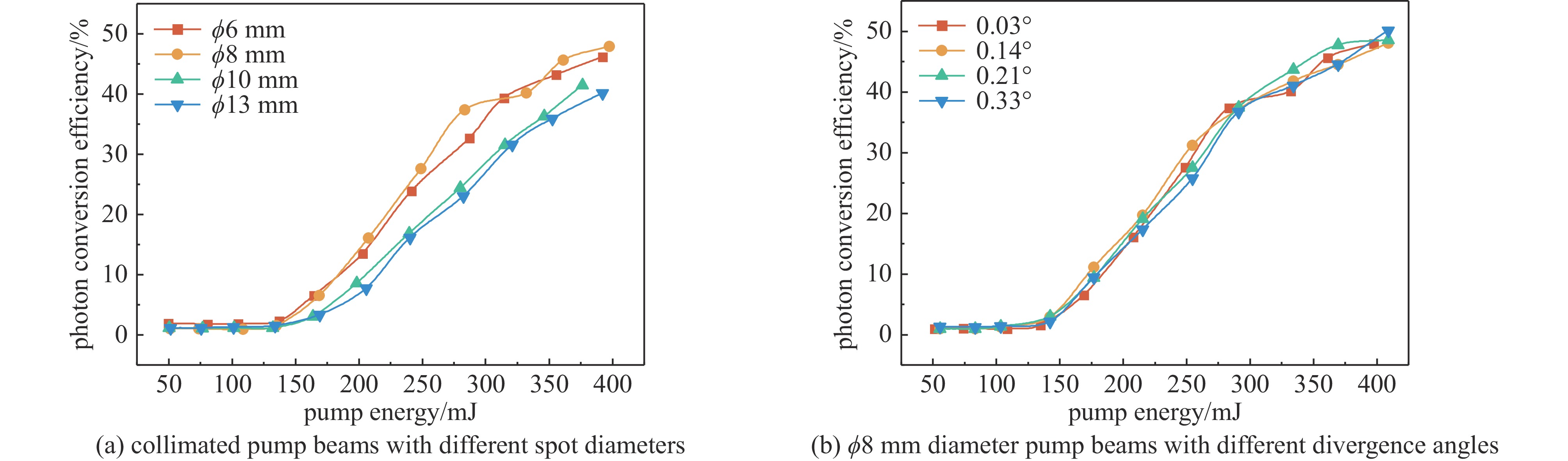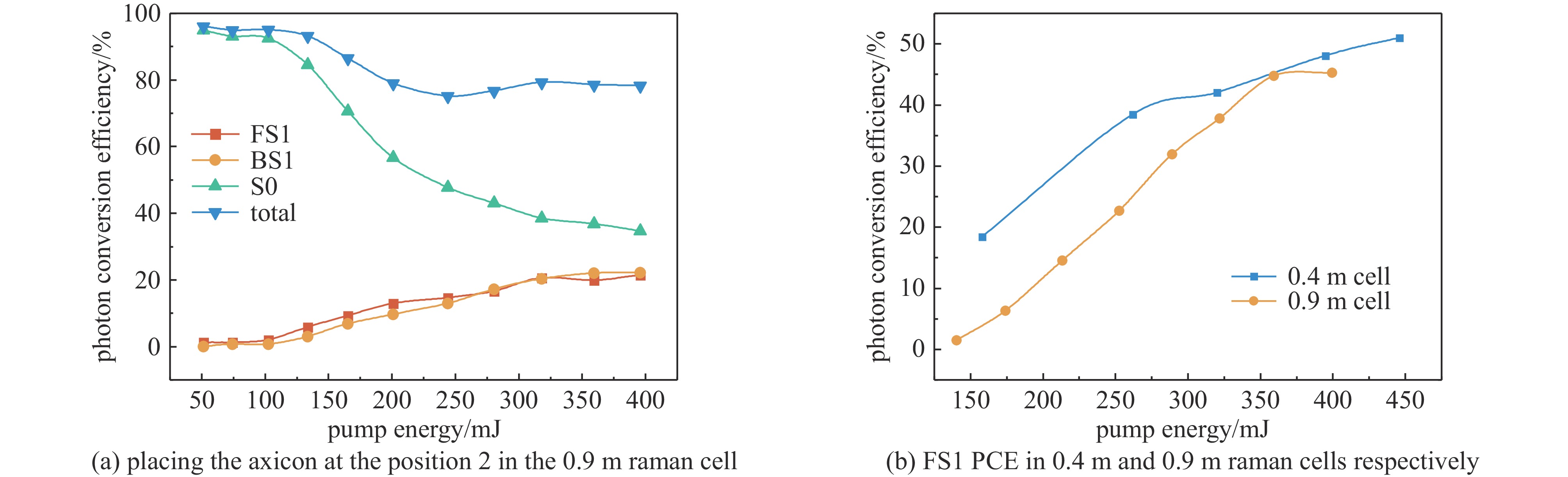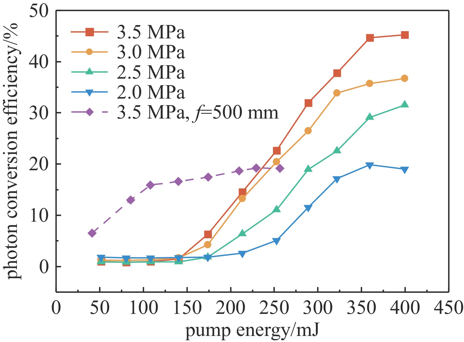 为了实现拉曼激光装置的小型化并抑制激光诱导击穿现象,利用锥透镜将泵浦激光调制成贝塞尔光束以实现受激拉曼变频。实验结果表明,增益介质的气压,泵浦光的直径,锥透镜的底角均对光子转化效率产生影响。在3.5 MPa甲烷中,1064 nm波长、366 mJ脉冲能量的泵浦光能够产生128 mJ的1543 nm前向拉曼激光,光子转化效率达到50.7%,且有望在更高气压和更高泵浦能量下实现更高转化效率。遮挡锥透镜中心圆角尖端,仍可保留97 mJ的拉曼激光脉冲能量,此时光束质量β=2.19。实验验证了拉曼池可设计为长度0.4 m而不损坏窗口。综合多个实验结果可以推论,在不牺牲转化效率的前提下,拉曼池可以进一步缩短至0.3 m。通过轴向移动锥透镜在长拉曼池内的位置,可调节前后向斯托克斯光的输出比例。