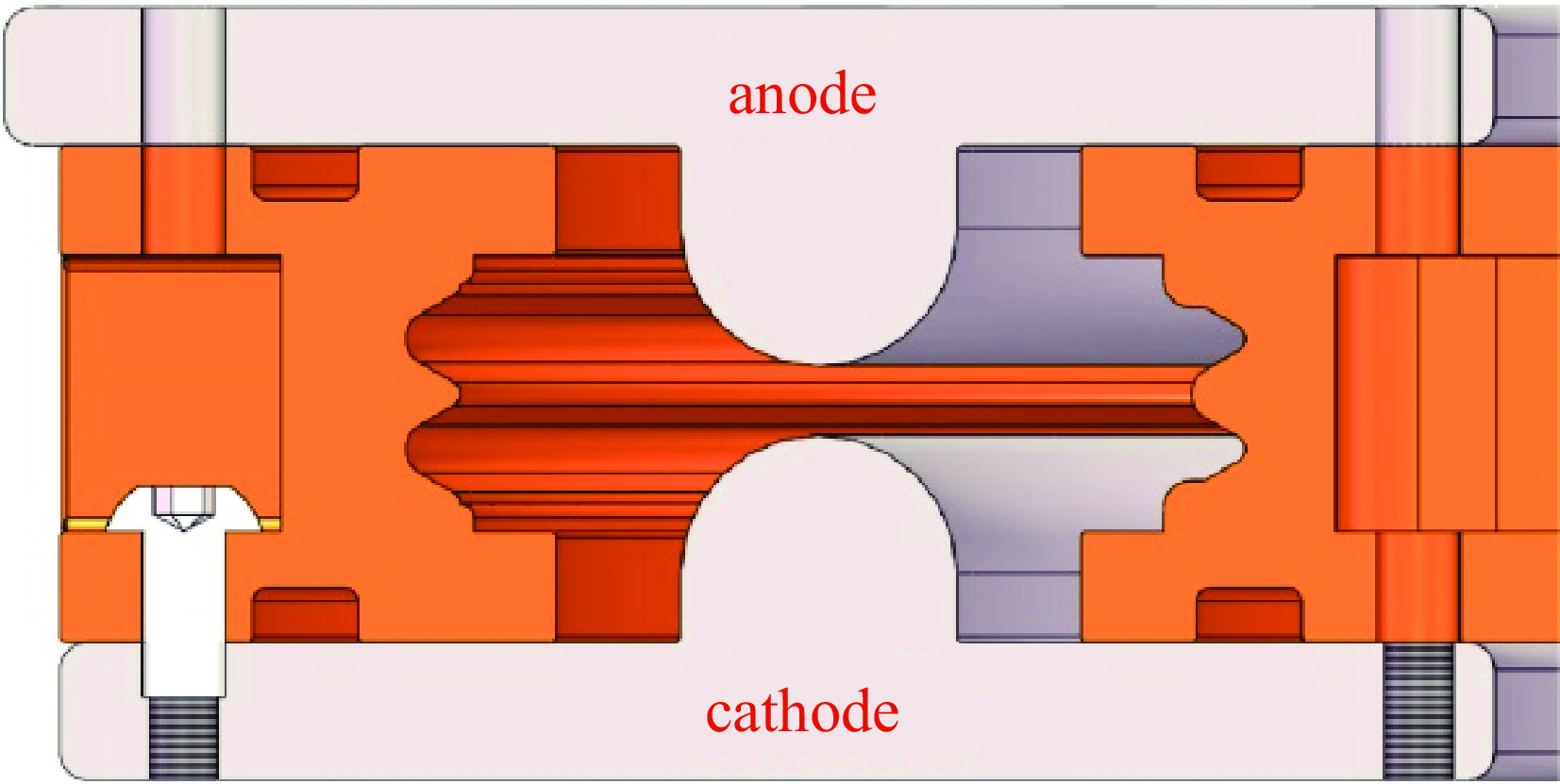 为了满足研制兆瓦级大功率回旋行波管对高压、大电流、低电子注速度零散磁控注入电子枪的迫切需求,针对性地给出了一支新型磁控注入单阳极电子枪的设计方案。该新型电子枪方案引入曲面阴极结构,以降低电子枪的速度零散,同时有效增大阴极发射带面积,降低阴极发射密度,从根本上提高电子枪的工作稳定性与寿命。PIC仿真的结果表明:在115 kV、43 A的工作条件下,该电子枪的横纵速度比为1.05,速度零散为1.63%,引导中心半径为3.41 mm,满足应用需求。