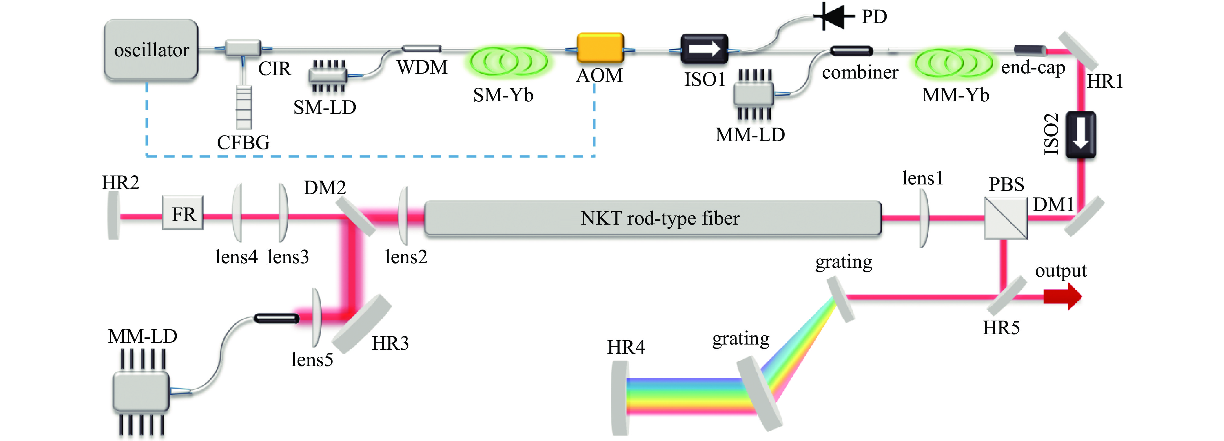 基于啁啾脉冲放大技术,采用棒状光子晶体光纤作为核心增益介质,成功搭建一套百瓦级的高功率飞秒光纤激光系统。在主放大器部分,通过反向泵浦与单棒双通结合的放大形式,实现泵浦功率-放大后信号光功率的转换效率超过60%,实现了高的转换效率。放大过程中有效避免了横向模式不稳定和非线性光谱畸变,输出光斑椭圆度为95%。采用双光栅结构对输出激光进行脉宽压缩,最终实现了中心波长