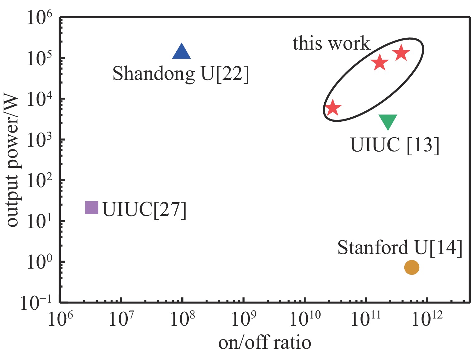 金刚石优异的材料特性,认为是用作光导开关器件的理想候选材料。然而,金刚石光导开关器件暴露出导通电阻大及器件耐压低的问题。为提升金刚石光导开关的器件性能,采用不同氮掺杂浓度及厚度的单晶金刚石材料,并通过氮化硅材料钝化处理,制作了垂直结构的金刚石光导开关器件。通过表征手段获取了金刚石的掺杂浓度梯度。以波长为532 nm的激光作为触发源,在不同的直流偏置下获得了光导开关器件的开关响应特性。实验结果表明:氮掺杂金刚石光导开关器件均展现出优异的开关比(~1011),及亚纳秒量级的上升沿及下降沿性能。其中,氮掺杂浓度高的金刚石材料,其对应的光导开关器件导通电阻小。通过降低金刚石材料厚度,在偏压为4 kV(电场强度为110 kV/cm)下实现了光导开关器件导通电阻为28.9 Ω,对应的输出峰值功率为128 kW,进一步提升了器件性能。通过氮掺杂浓度设计、衬底厚度减薄及氮化硅钝化处理等,本工作成功制备了具有较好性能的金刚石光导开关器件,为金刚石光导开关器件的性能提升提供指导。