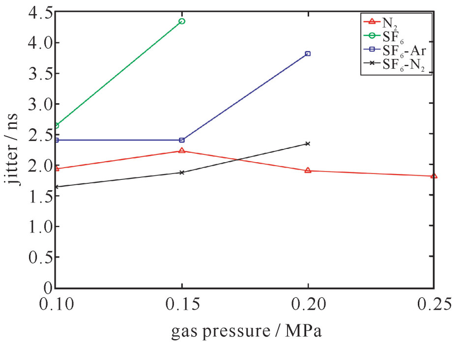 This paper presents the design of a repetitive frequency gas spark switch. The switch adopts a three-electrode field-distortion structure, which has the advantages of small size and compactness, and it can work at voltage 100 kV, current 10 kA. Experimental study of the trigger characteristics of this field distortion spark gap switch were carried out with the changes in frequency, gas composition, working pressure and work coefficient. The breakdown time delay and jitter of the switch are calculated, and the main factors influencing the breakdown characteristics of the switch are analyzed. The experimental results show that the time jitter of the switch increases with the repetitive frequency. The switch has better performance when filled with gas mixture of SF6 and N2 of volumetric ratio of 1 ∶1, the working coefficient mainly affects the time jitter of the second discharge spark gap (gap 2).
