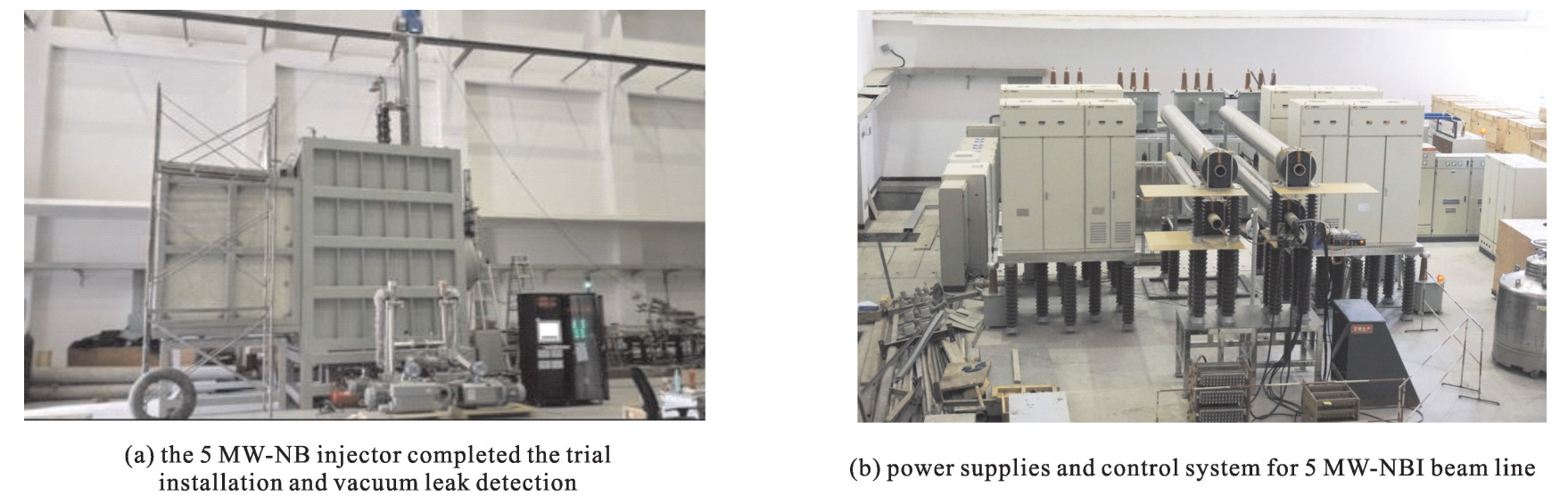 In order to carry out the physical experiment of magnetic confinement core combustion plasma, the HL-2M device under construction is intended to construct three 5 MW neutral beam injection heating lines. This paper briefly outlines the overall planning of the neutral beam injection (NBI) heating system of the HL-2M device, the design of the first 5MW-NBI heating beam line, the ion source commissioning experiment, the installation and test results of the injector core components. Through debugging, for single ion source the extraction beam current reaches 36 A, the acceleration voltage is 75 kV, the ion beam power reaches 2.4 MW, and the pulse width is 3 s. It is found by testing that the convergence angle error of 4 ion beam from the injector is less than +0.1°, the deviation between the test values and simulation values of magnetic field with deflecting magnet for deflecting residual ions is less than ±5%, and the static vacuum value of the injector reached 1.0×10-3 Pa. The injector has adopted a large non-standard cryogenic pump with a pumping speed of 2.4×106 L·s-1. The trial assembly and test results of the first 5MW-NBI heating beam show that the beam line can meet the technical requirements of NBI heating on HL-2M device.