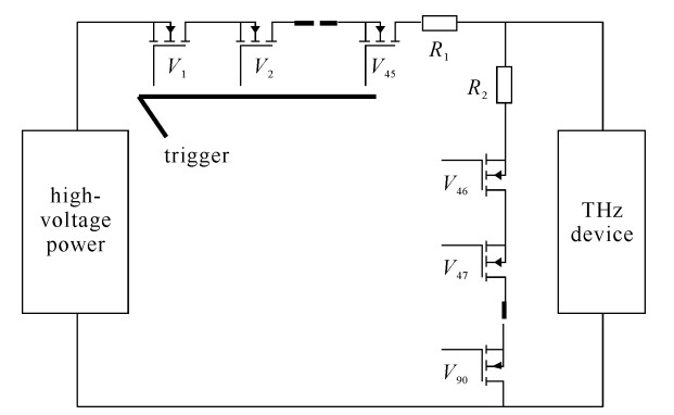 The THz device is a new type of microwave device which operates in the 0.1-10 THz frequency band, and it has important application value in the field of communication, imaging, detection and other military applications. Compared with the traditional vacuum microwave devices, the THz device has the characteristics of light load and high duty cycle. A high frequency pulsed power supply system has been developed for the experimental research on THz devices. The output voltage is 30 kV, the pulse current is 200 mA, the maximum frequency is 3 kHz and the pulse width is 10-100 μs. The main circuit adopts LC series resonant constant current charging technology to improve the reliability in the case of fire load. At the same time, a series pulse switch based on MOSFETs is developed to obtain fast pulse rise and fall time. A PLC and a computer have been used to realize the local and remote control. Relevant simulation and test show that the system output meets the load requirements, and the system can work stably in high frequency, load arc conditions.