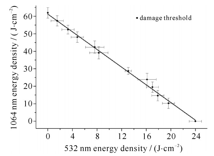 The wavelengths of 1064 nm and 532 nm of the pulsed Nd: YAG laser were used to irradiate the fused silica to study the interaction between different wavelengths of laser with fused silica. The laser induced damage characteristics in fused silica surface were researched under separate of simultaneous irradiation of 1064 nm and 532 nm wavelengths. Testing the damage probability under different energy density, we obtained the damage probability curves and typical damage morphologies. The results show that the initial damage threshold under simultaneous irradiation with 1064 nm and 532 nm is always less than that under single wavelength irradiation. Add a certain amount of 532 nm laser to 1064 nm laser, fused silica improves the absorption efficiency for 1064 nm. The damage density of fused silica increases under double wavelength simultaneous irradiation. The reason is that the surface defects of fused silica have different absorption mechanisms for different wavelengths.