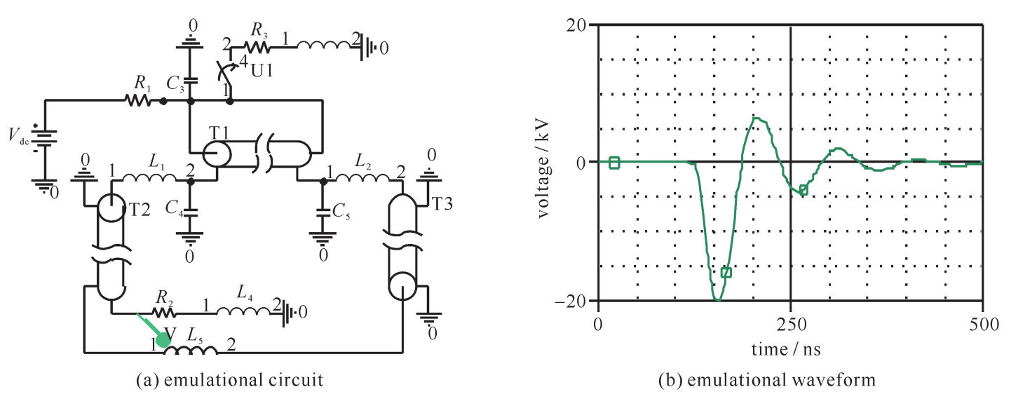 The paper presents a design of high voltage pulse generator based on high voltage switch formed by a stack of metal oxide semiconductor field-effect transistor (MOSFET). Two pulses at both ends of out metal layer in transmission line are generated by the self-matched transmission line circuit using high voltage switch made by many opto-isolator triggering MOSFETs in series. Then, a higher power pulse with amplitude of 20 kV on 200 Ω load, duration of about 40 ns and repetition frequency of 20 kHz is generated by the technique that transmission line transformers (TLTs) synthesize two pulses. An emulational circuit model is designed after the structure of pulse generation device is analyzed. The distortion of output pulse is analyzed by the model. Factors influencing the output pulse waveform are discussed. A reference for optimizing output pulse is put forward.