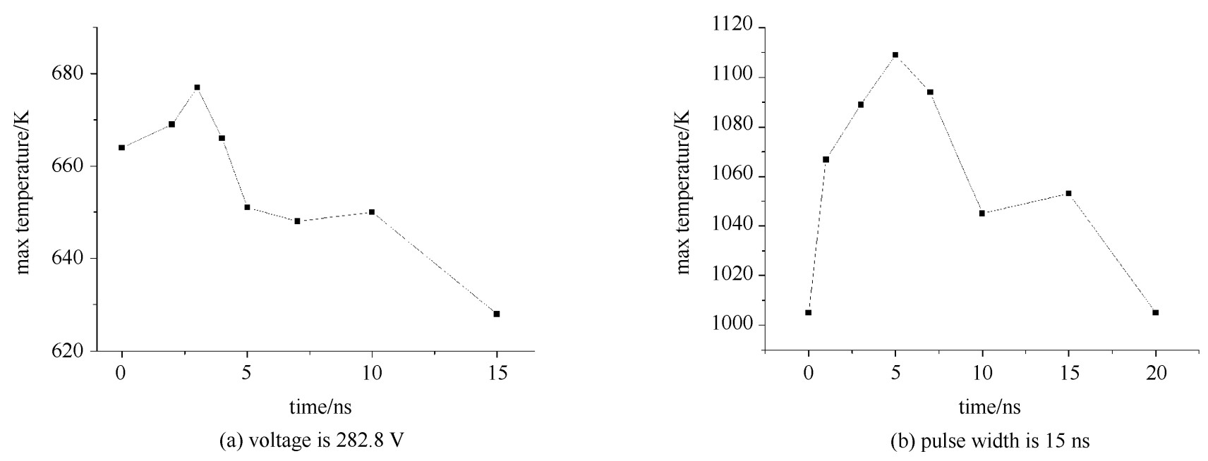 Based on the device physics simulation, focusing on the influence of pulse interval on thermal damage process of PIN limiter, the peak temperature of combined pulses with different pulse interval from 1 to 20 ns is studied. Numerical simulation results show that the pulse interval in which the device temperature rises most has a positive relationship with intrinsic region thickness. The thermal breakdown mechanism is analyzed. It is the spike leakage of the second sub-pulse that makes the temperature rise speed up. And the high temperature of the P-type region also causes the electrothermal feedback which makes it easier to get higher temperature.
