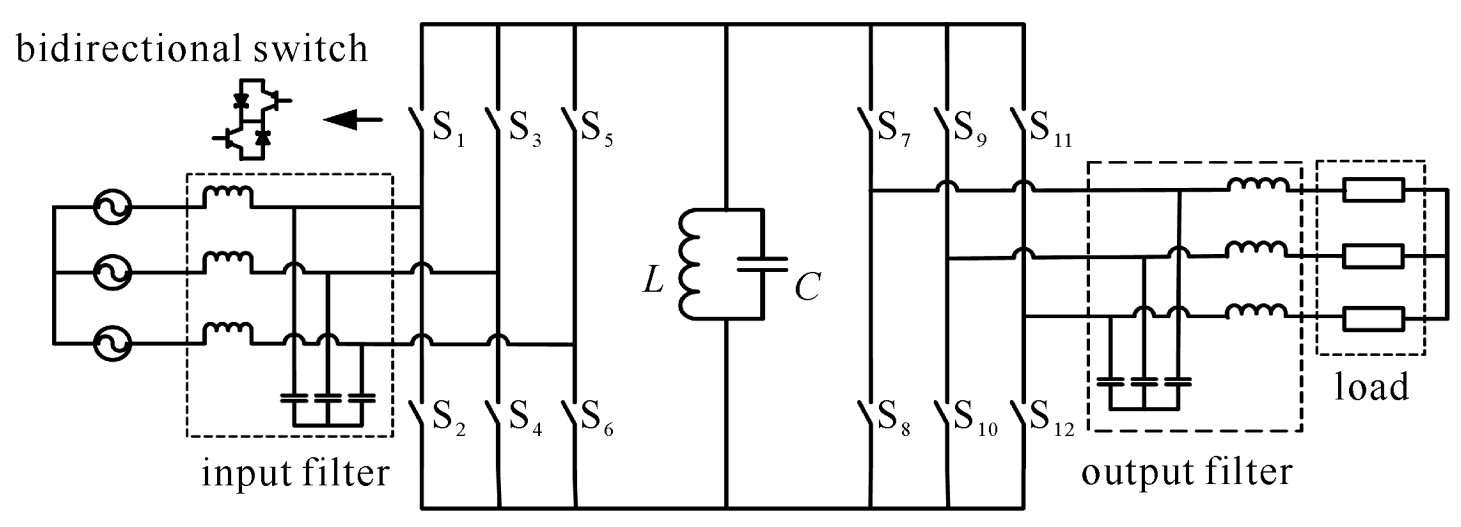 Charging power supply based on AC-link has the advantage of high power density and can be used for primary energy source of high-power microwave (HPM) system. In order to meet the requirement of high power density, a three-phase AC/AC converter based on AC-link parallel resonance is studied. Topological structure and operating principle of the converter is analyzed, the specific working process of 16 modes and the realization of soft-switching are described and the algorithm of switches on time is given. A 15 kW simulation platform is built and energy conversion processes under different loads are analyzed. The result shows that the conversion of voltage and frequency is realized, currents of both sides are sinusoidal, also, unity input power factor and zero voltage switching(ZVS) are realized.