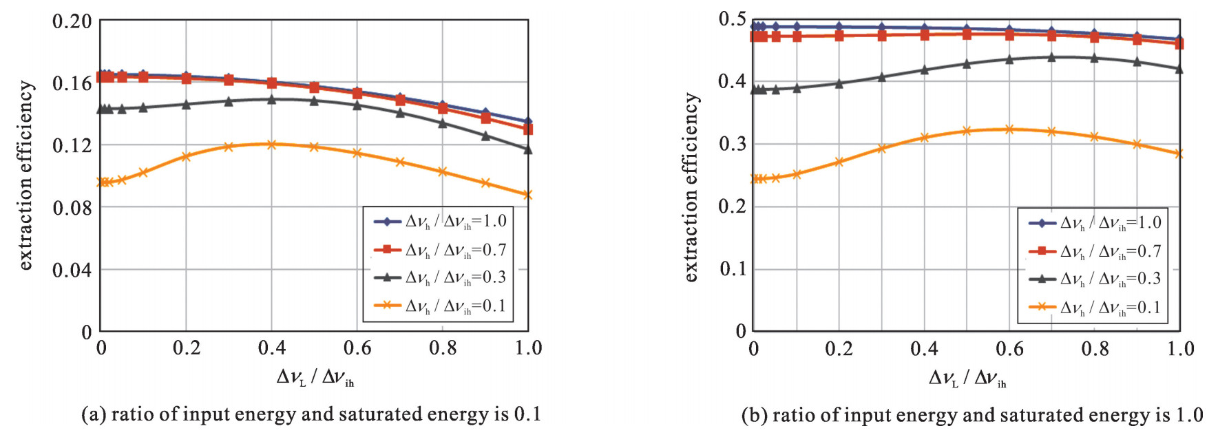 Based on the broad-band pulsed laser amplification model of neodymium glass, the relationship between energy extraction efficiency of the pulsed laser amplification and input fluence, pulse widths and spectral bandwidths (or wavelength distributions) was studied by numerical simulation. The calculation results show that the energy extraction efficiency of the broadband amplification in neodymium glass increases with the increase of the input luminous flux, and finally tends to a certain value. For the medium with uniform broadening, the energy extraction efficiency decreases with the increase of the bandwidth. For the medium with non-uniform broadening, the energy extraction efficiency increases gradually with the increase of the bandwidth, reaching the maximum value, after which it declines. For a mixed widened medium with a uniform widened to non-uniform widened linewidth ratio of 0.1, using a broadband laser can achieve an efficiency improvement of approximately 80% under saturated flux input conditions.