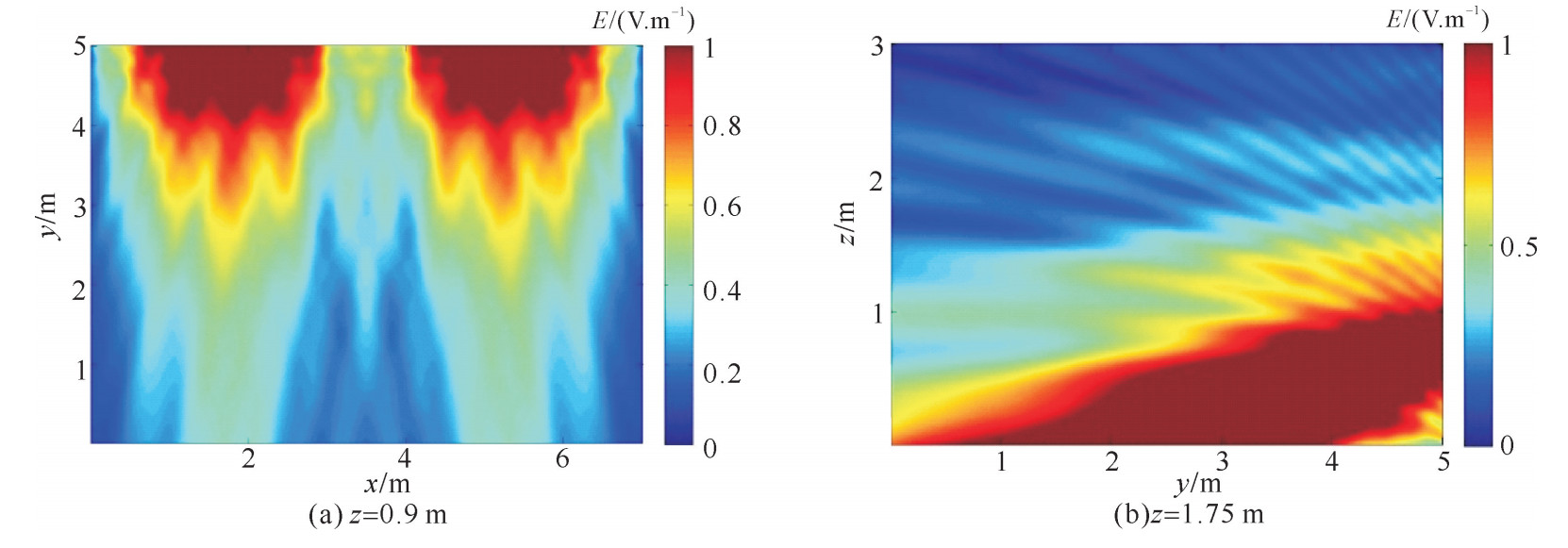 The coupled field distribution of high power microwave in buildings is calculated by physical optics method. With the transmittivity of the wall and window, the approximate field distribution on the inner surface of wall can be calculated. Substituting the surface transmitted field distribution of the wall into the vector diffraction formula, we can get the transmitted field in the building. With the reflectivity of the floor, the approximate reflection field on the floor's surface can be calculated. Substituting the surface reflected field distribution of the floor into the vector diffraction formula, we can get the reflected field in the building. The superposition field is obtained by vector addition of transmission field and reflection field. The field distribution result of this method and that of the finite-difference time-domain method are in good agreement. The advantages of physical optics method lie in its clear physical image, small amount of computation and fast computation speed.The method is suitable for the calculation of coupled field distribution in large buildings.