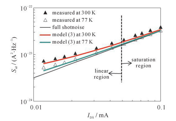 In order to effectively characterize the RF noise characteristics in the strong inversion region of nanoscale MOSFET, the noise modeling method is studied. Based on the analysis of extracted results of radio frequency small-signal equivalent circuit parameters of 45 nm MOSFET, a compact model for the MOSFET's drain current noise is proposed. This model fully describes three kinds of main physical sources that determine the noise mechanism of 45 nm MOSFET, including intrinsic drain current noise, thermal noise induced by the gate parasitic resistance, and coupling thermal noise induced by substrate parasitic effect. The accuracy of the proposed model is verified by noise measurements, and the intrinsic drain current noise of 45 nm MOSFET is proved to be the suppressed shot noise, and with the decrease of the gate voltage, the suppressed degree gradually decreases until it vanishes.