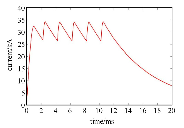 A novel pulsed power supply with high energy efficiency using multiple capacitor banks discharging sequentially is investigated to generate the demanded pulsed current (flattop time 1-10 ms, minimum 24 kA) for the pulsed magnetic window technology. The electrical topology is designed and the relationships of power supply parameters, discharging branches and current ripples as well as their sensitivities to the variation of circuit loop parameters are analyzed. An optimized structure of six discharging branches is proposed and validated by the experiments. The turn-off reliability of the main discharging switches are improved by making them in series. The ability to endure the reverse voltage of crowbar diode when turning off is enhanced by a crowbar module consisting of two branches in parallel with three tandem diodes in each branch.