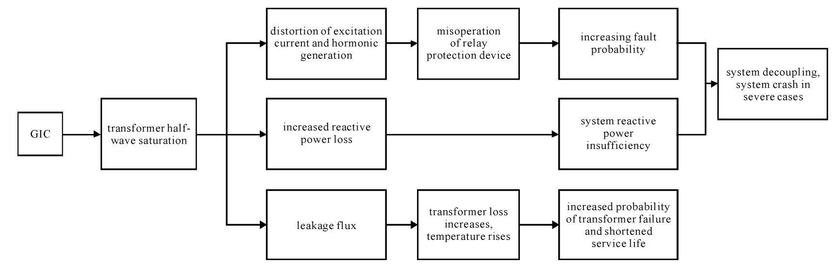 In the condition of strong magnetic storm, geo-magnetically induced current (GIC) flowing through the neutral point of the transformer, causes the increase of reactive power loss of the transformer.This might lead to overload of the reactive power compensation device, drop of the bus voltage and occurrence of a chain fault, which in turn causes a blackout of the system.Comparing the characteristics of each link in the fault chain and the development law of the power system blackout caused by magnetic storms, the fault chain model is used to simulate the process of power outage under conditions of geomagnetic storm.The article determines the propagation path of cascading failures based on the self-organizing critical theory and the safety margin of non-faulty circuits.Combining the IEEE-RTS 79 system parameters, the geo-location of each bus is estimated.Taking this system as an example and using Power World simulator, the research results verify that the proposed model can reflect the geomagnetic storm parameters against the power system fault chains and the identification of weak links under given grid conditions.The research results can provide a basis for quantifying and preventing disasters in the magnetic storm condition.