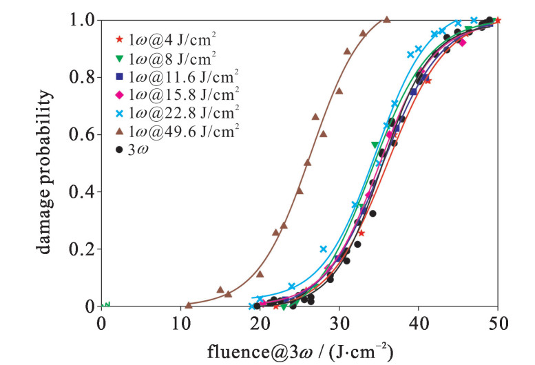 The initial damage and damage growth of fused quartz optical elements irradiated by fundamental frequency, double frequency and triple frequency lasers alone and at the same time are studied comparatively.The effects of fundamental and double frequencies on the initial damage and damage growth induced by triple frequencies are emphatically studied.The conversion factors of fundamental frequency and double frequency relative to triple frequency are analyzed.Research results show that, when the energy density of fundamental frequency and double frequency is low, their influence on damage probability curve of triple frequency can be neglected.However, it will cause an increase in the degree of damage.In multi-wavelength simultaneous irradiation damage growth, the damage growth threshold mainly depends on the energy density of triple frequency, and the damage growth coefficient is related to the total energy density.The conversion factor can reflect both the wavelength effect of initial damage and damage growth and the energy coupling effect between wavelengths.