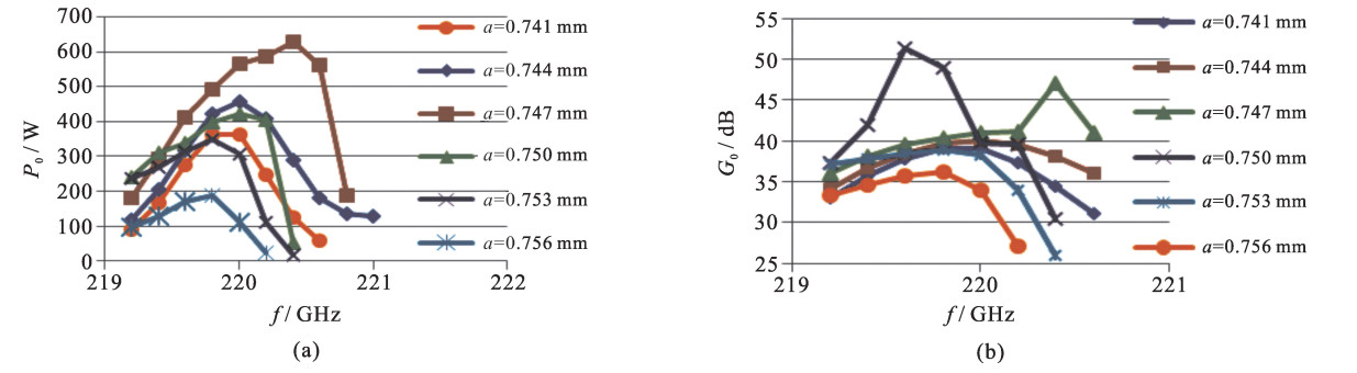 An extended interaction klystron (EIK), which is composed of an input cavity and an output cavity both based on 8 periods of staggered double rectangular waveguide structure (SDRWS) and an intermediate cavity based on 6 periods of SDRWS, is calculated in detail on computer.After calculating reflection coefficient S11 of the input cavity and output cavity and the eigenmodes of the intermediate cavity, the structural parameters of the input cavity and output cavity and the intermediate cavity are determined, then PIC simulation is done to predict the EIK's performance, the results show that the EIK has an 1 GHz 3 dB bandwidth (219.5-220.5 GHz), a 456 W maximum power and a 40.06 dB maximum gain.Furthermore, stagger tuning by adjusting the structural parameter aof the intermediate cavity is performed to analyse howaaffects the EIK's performances, and the results show that the 3 dB band of the EIK mainly depends on the passband of the input cavity and output cavity, it also depends on the resonant frequency of the intermediate cavity in some cases.When the resonant frequency of the intermediate cavity is located at the lower or higher ends of the passband of the input cavity and output cavity, the 3 dB band of the EIK may be extended to certain extent.Particularly, when the resonant frequency of the intermediate cavity is located at or beyond the higher ends of the passband of the input cavity and output cavity, it is verified that the EIK has steady output signal featuring with pure spectrum and flat gains over the 3 dB band.The final results of the stagger tuning show that, when the structural parameter aof the intermediate cavity is 0.747 mm, the EIK reaches almost the optimum performances, with an 1.2 GHz3 dB bandwidth (219.5-220.7 GHz), a 630 W maximum power companied with a 11.3%efficiency, and a 47 dB maximum gain.